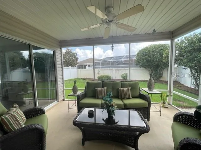 Experience The Villages Lifestyle – Rent This Beautiful Callaway Courtyard Villa! Step inside this stunning Callaway Courtyard Villa and be welcomed by a bright, cheerful open layout with vaulted knockdown ceilings that create a spacious feel. This home offers 2 bedrooms, each with its own private bath, making it perfect for both residents and guests. The Master Suite easily accommodates a king-size bed and features a large walk-in closet, dual sinks, and a beautifully tiled shower with a built-in seat. Enjoy the glass-enclosed lanai with sliding panels, ideal for soaking in the Florida breeze — and since it’s north-facing, it stays bright yet comfortably shaded. The private courtyard yard is the perfect size, with green grass for your four-legged friends and a cozy outdoor patio for relaxing or entertaining. The eat-in kitchen is warm and inviting, featuring maple cabinets, a double stainless-steel sink, pull-out shelves, and a closet pantry. A breakfast bar connects the kitchen to the living area, making it easy to chat with guests while preparing meals. You’ll also love the upgraded stainless-steel refrigerator. This property is conveniently located 1.6 miles from Bonifay – 0.4 miles from Charlotte Adult Pool, 0.9 miles from Captiva Family Pool, 5 miles from Lake Sumter Landing, This is a charming, like-new home offering comfort, privacy, and a true Villages lifestyle. Don’t miss this opportunity — make it yours to rent today!