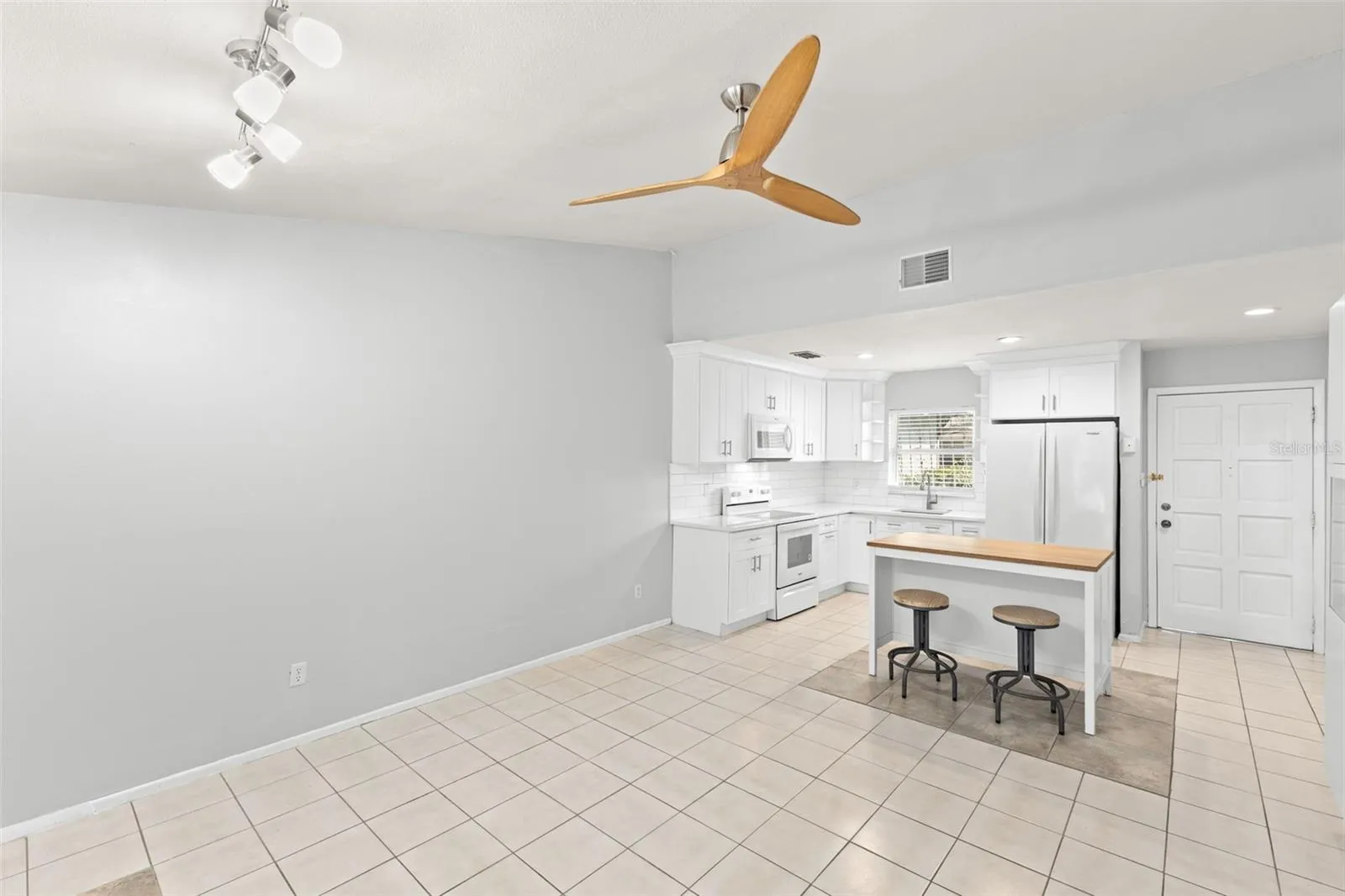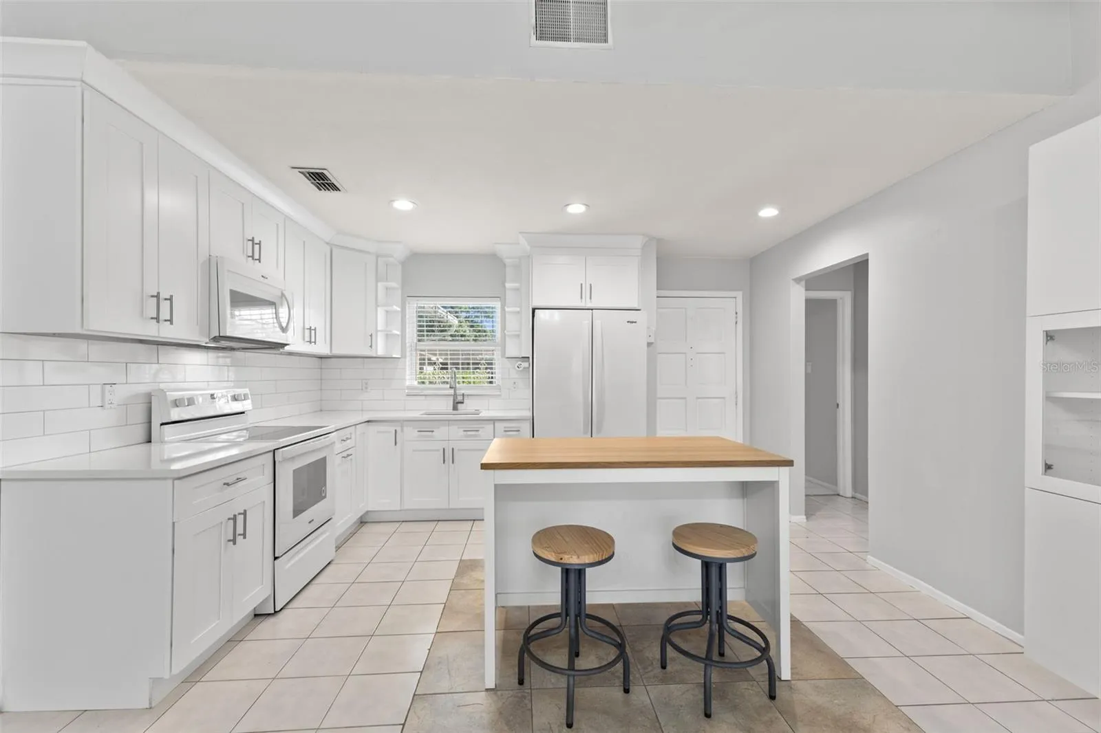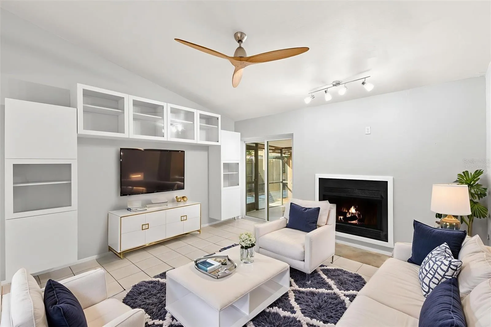 One or more photo(s) has been virtually staged. Welcome to this beautifully updated single-story villa, offering the perfect blend of comfort, privacy, and style. Nestled in a quiet, well-kept community, this home features attractive landscaping, mature trees, and a welcoming brick façade that adds to its curb appeal. Step inside to an open floor plan with a renovated kitchen complete with crisp white cabinetry, sleek subway tile backsplash, solid-surface countertops, and matching white appliances. A charming center island with butcher-block top provides additional workspace and casual seating—perfect for morning coffee or quick meals. The bright and open living space has a vaulted ceiling that enhances the spacious feel. The living room centers around the fireplace and flows seamlessly to the screened patio through sliding glass doors—perfect for outdoor dining or simply enjoying the fresh air. A modern ceiling fan and updated lighting add a contemporary touch, while the built-in shelving and cabinetry provide excellent storage and display options. Both bedrooms can accommodate king size furniture and the bathroom offers a stylish blend of classic tile and updated fixtures, including a modern vanity and walk-in shower. Additional features and benefits include a neutral paint pallet, tile flooring throughout, lighted ceiling fans, blinds, washer/dryer in unit, storage shed and gazebo in the fenced back yard and parking steps to the front door as well as guest parking. Located close to shopping, restaurants and quick access to FL-580.