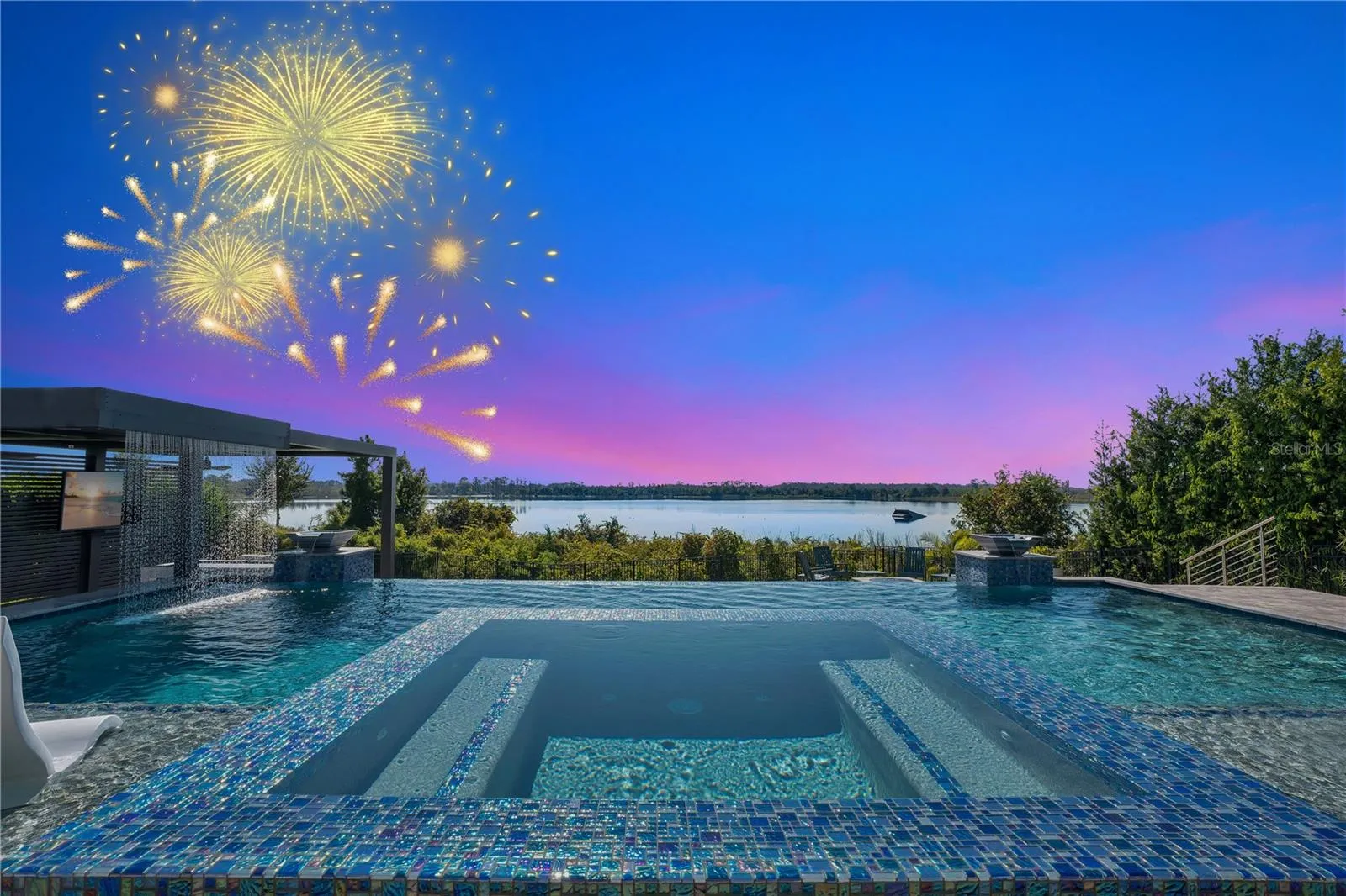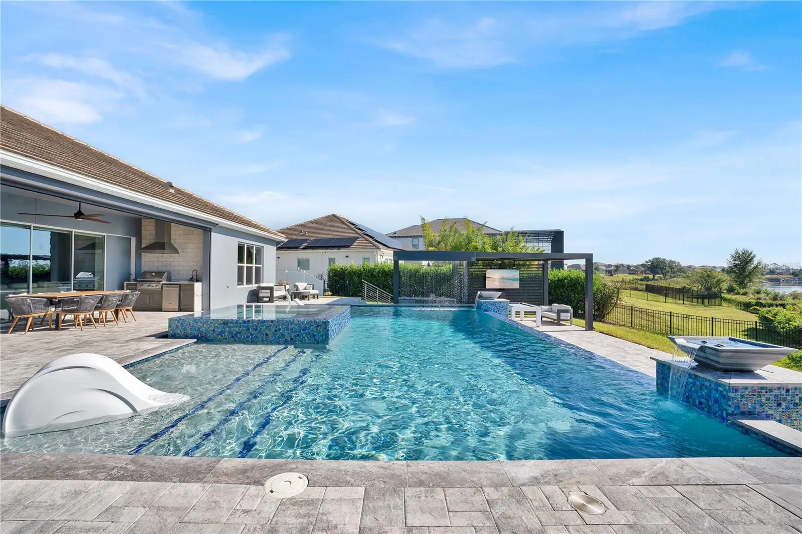 Step outside to the true showpiece: a covered lanai with motorized shades, full summer kitchen, built-in grill, and bar, all overlooking the resort-style backyard. A sleek pergola adds architectural style while the rain-style waterfall feature flows toward the infinity-edge pool, complemented by a summer kitchen extension and pool bar that make outdoor entertaining effortless. A private basketball court sits to the side of the fully fenced 0.36-acre homesite, framed by a Podocarpus privacy hedge and decorative fencing for a lush, secluded retreat. From your firepit, savor the beautiful sunsets over the lake and, as night falls, enjoy the distant sparkle of theme park fireworks across the water. Additional highlights include a three-car garage and access to resort-style community amenities—walking paths, green spaces, pool, playground, and courts. This residence has been featured in Staycation Magazine and Winter Garden City Lifestyle for its curated design and outdoor lifestyle appeal. A 3D virtual tour and floor plan are available.