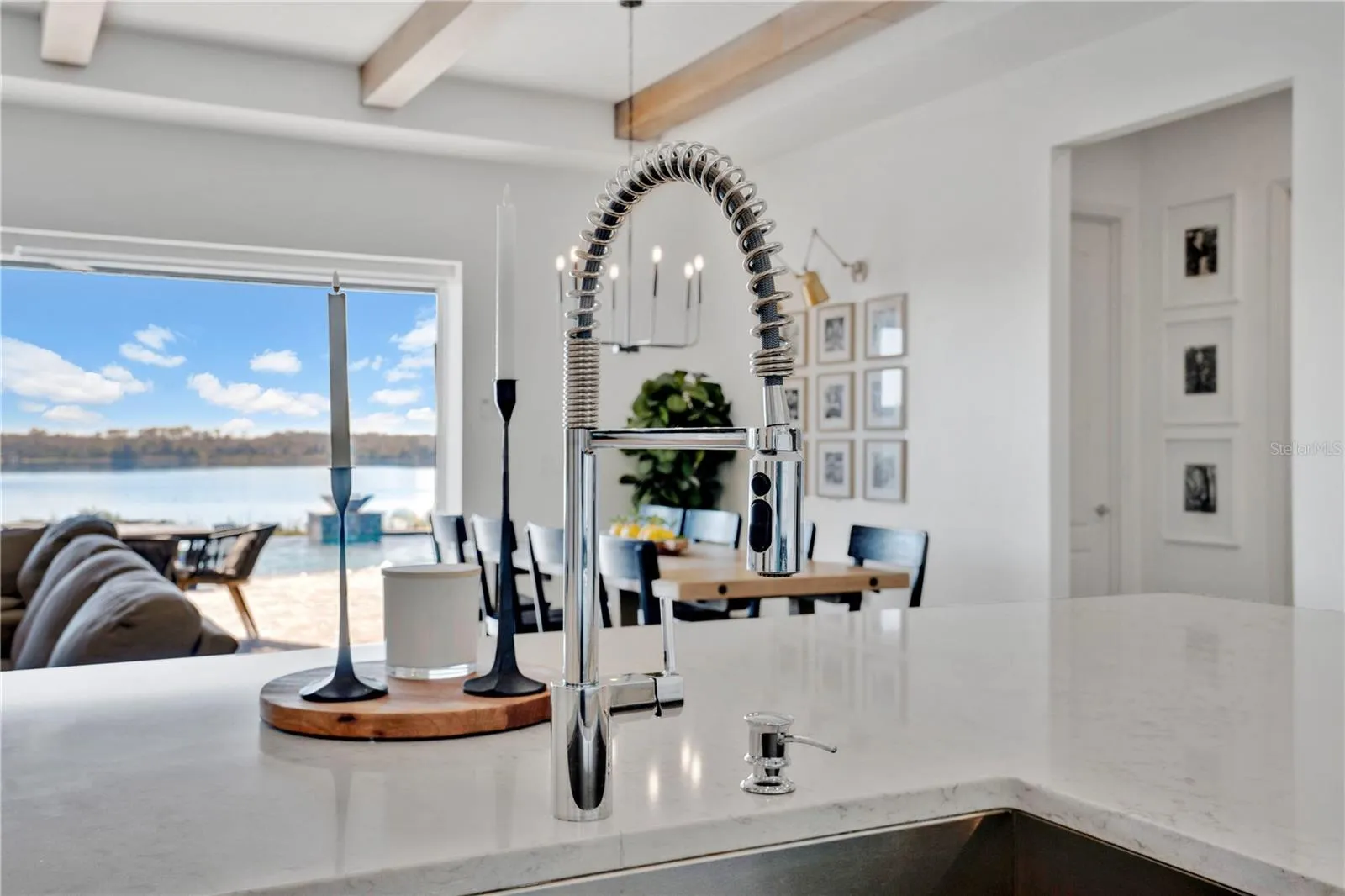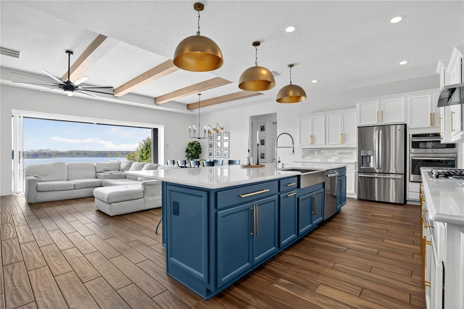 To your left, the gourmet kitchen is designed for both function and flow, showcasing an oversized island, gas cooktop, pot filler, tall cabinetry, soft-close drawers, and a whole-home water filtration system. The kitchen opens seamlessly to the dining and living areas, creating an ideal space for gathering. All four bedrooms include custom-designed closets, while the primary suite offers direct lake views, a generous walk-in closet, and a spa-style bath with dual vanities and frameless glass shower. The 4BR/3.5BA split floor plan provides privacy and flexibility for everyday living or hosting.