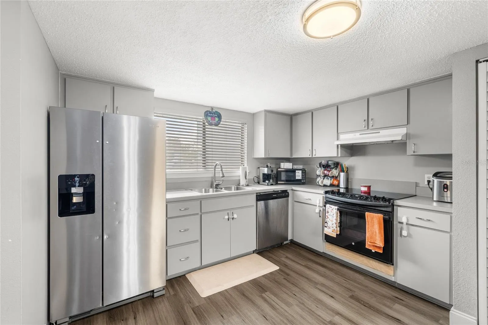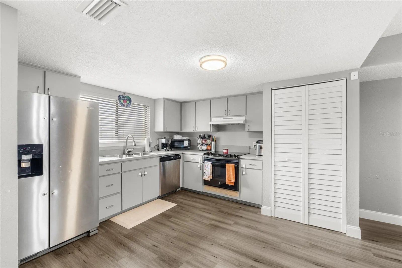 stainless-steel appliances including a refrigerator, dishwasher, and oven, along with updated cabinet