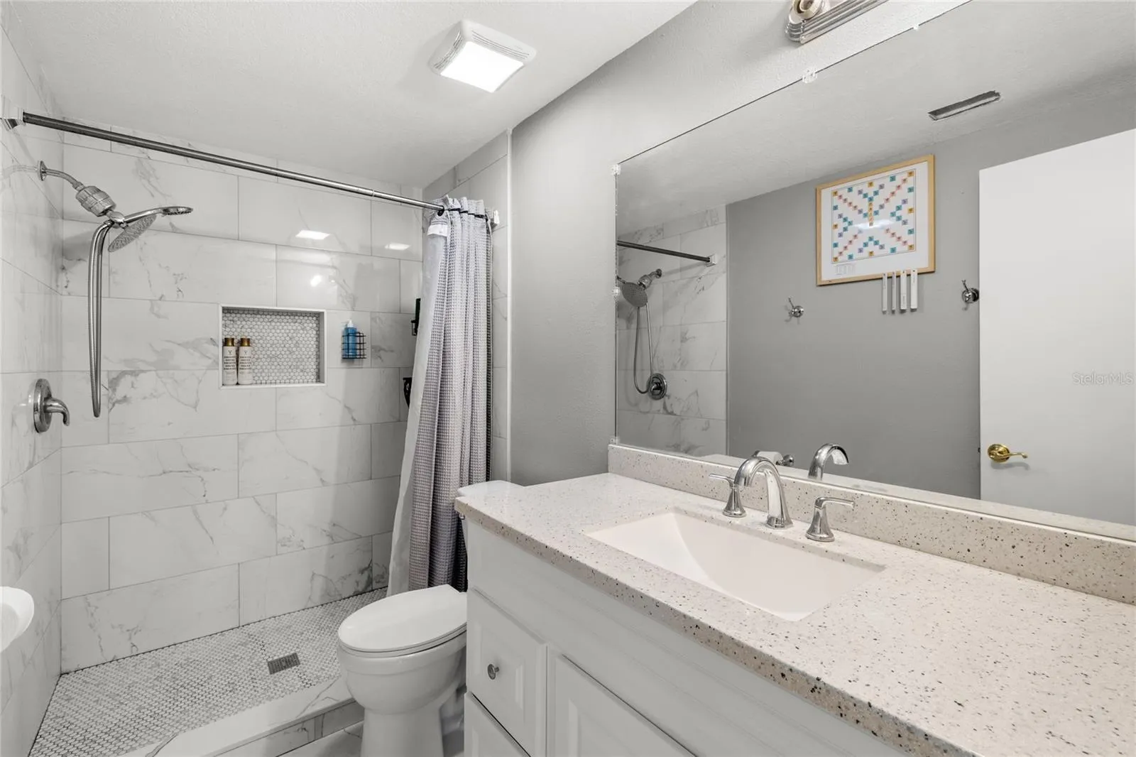 marble-looking tile flooring that extends into the shower, a newer vanity, and quartz countertops. There