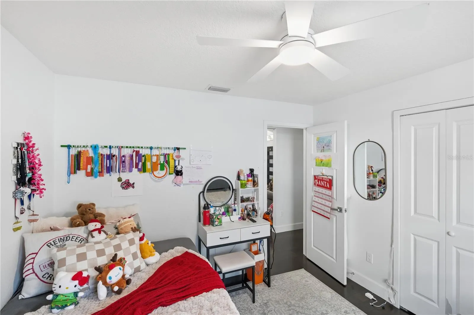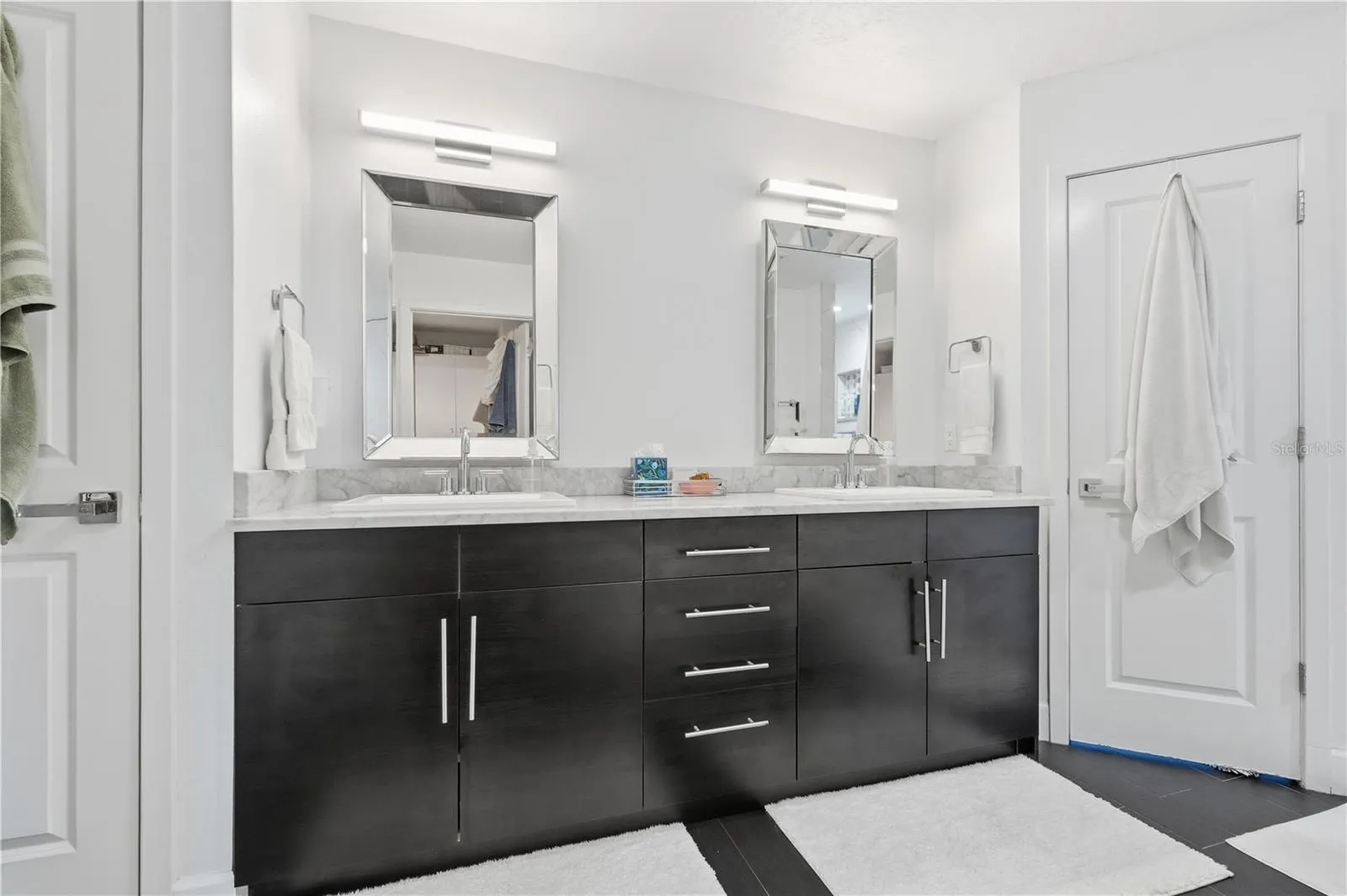 The stunning primary suite offers an oversized custom walk-in closet by California Closets and a spa-inspired bathroom with an impressive walk-in shower, double vanities, and premium granite countertops.