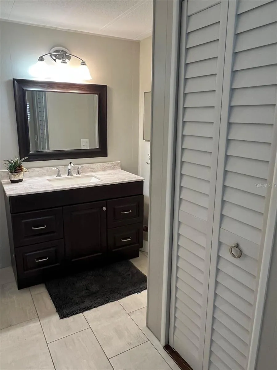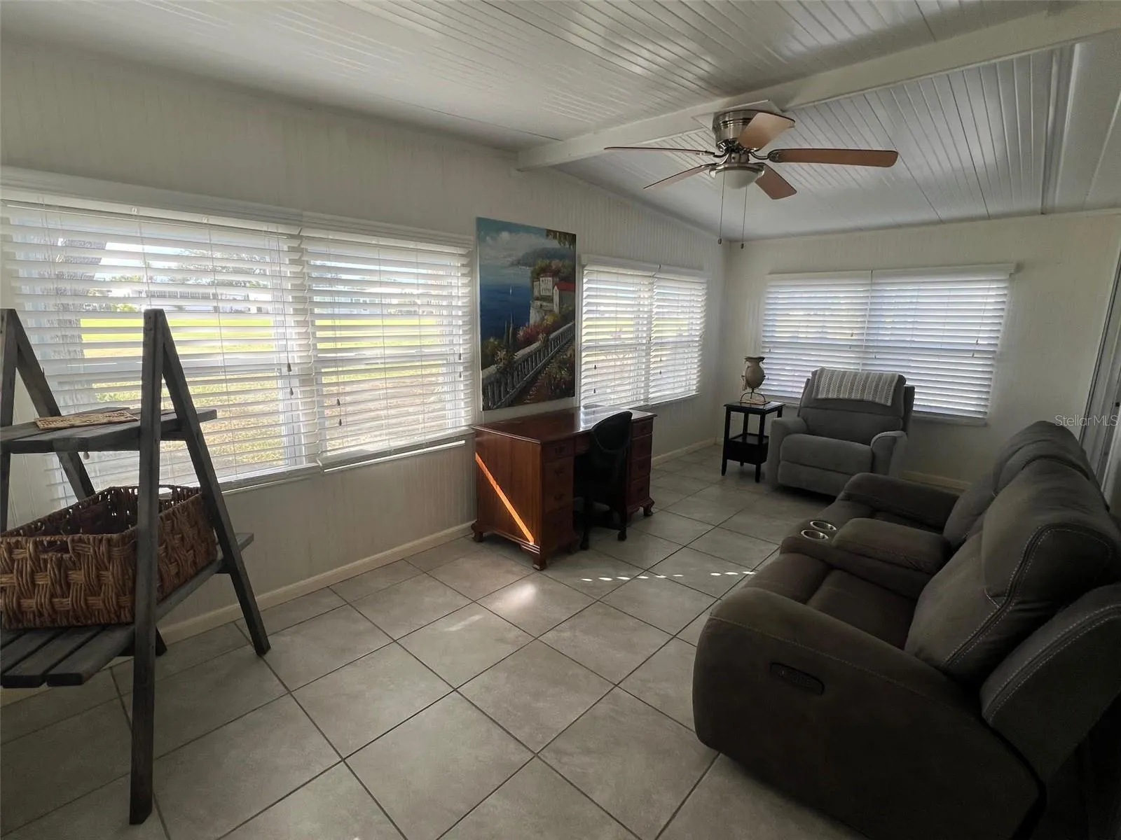 Perched directly on the picturesque golf course, this beautifully remodeled two-bedroom, two-bath home offers an inviting blend of comfort and style. Step into the modern kitchen, where sleek stainless steel appliances, abundant pantry storage, new cabinets, and polished countertops create an ideal space for culinary adventures. The open dining area seamlessly flows into a spacious living room, perfect for entertaining or unwinding after a day on the greens. From there, the living space extends to a light-filled Florida room, enhanced by elegant tile flooring and breathtaking views of the lush fairways. Softly painted walls and chic 2-inch faux wood blinds complement the warm laminate flooring that runs through most of the home, while both bathrooms feature fresh vinyl tiles for a contemporary touch. The guest bedroom provides ample space and comfort, with the adjacent guest bath thoughtfully updated to include a sleek new vanity and a shower-tub combination. Retreat to the expansive master bedroom, where you’ll find a tranquil en suite complete with a stylish new vanity and a luxurious walk-in shower. Every detail is thoughtfully considered, from the tasteful furnishings and décor to the ceiling fans, efficient ceiling ducts, and plantation-style closet doors, creating a home that is both functional and aesthetically pleasing.