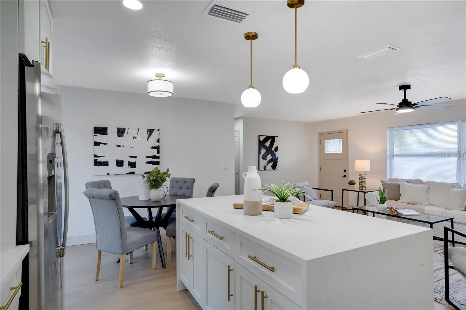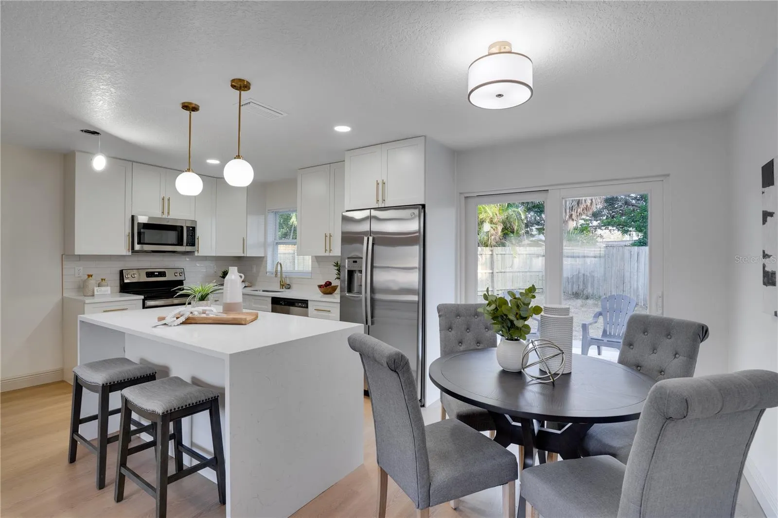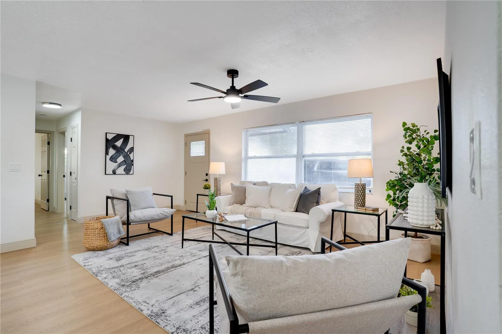 This 2-bedroom, 1-bath, 1-car garage home in St. Petersburg sits on a desirable corner lot and offers a fresh interior and exterior paint scheme, LVP flooring in the main living areas, and a modern kitchen and bathroom. The open concept layout creates an easy flow between the spacious living room and kitchen, which features stone countertops, stainless steel appliances, a gorgeous backsplash, recessed lighting, a center island, and plenty of cabinet space. A concrete patio overlooks the fully fenced backyard, making it a great spot to unwind or entertain, and the circular driveway adds extra convenience. Located just minutes from the water, but in a non-flood zone, this home is centrally positioned near parks (including Sawgrass Lake Park), beaches, shopping, dining, and entertainment. Don’t miss your chance to see this one, schedule your showing today!