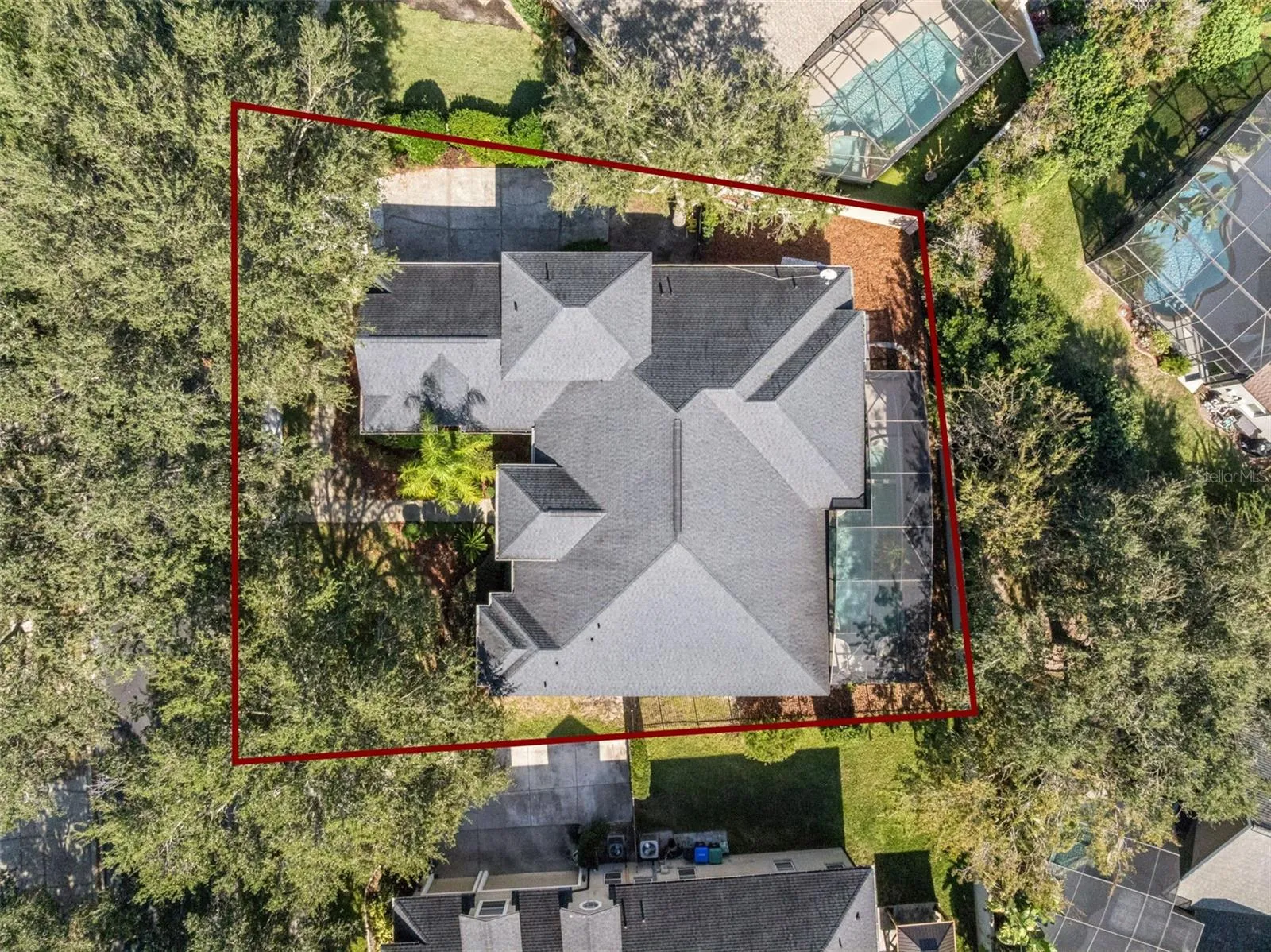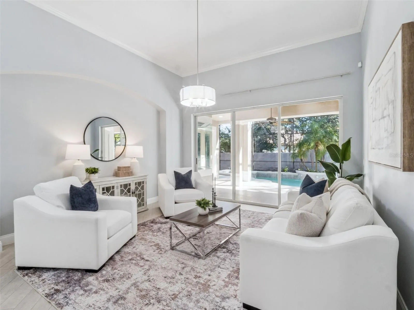 Outside, a screened retreat features a sparkling pool, covered patio, and refreshed landscaping that enhances the home’s clean architectural lines. The seamless transitions between the indoor and outdoor living spaces are perfect for entertaining and gathering.