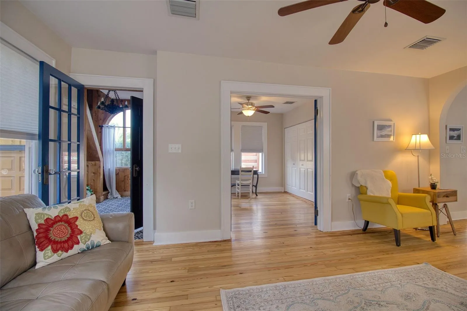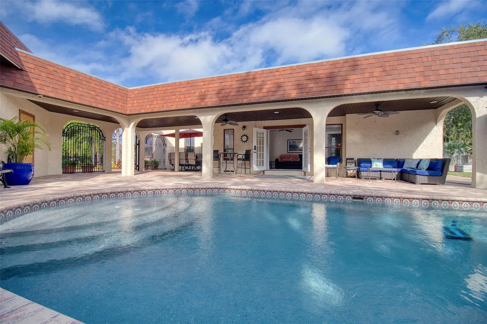 Elegance with a Spanish influence aptly describes this charming 3 bedroom, 2.5 bath pool home on over 1/4 acre lot that backs the Pinellas Trail on Broadway. This stylish 1925 home is warm and welcoming with elegant touches such as refurbished hardwood floors, high ceilings and original features such as a loft over the front entry, crown molding and a wood burning fireplace. The bathrooms have been tastefully renovated, and an additional 1/2 bath/Pool Bath was recently added. The renovated kitchen features granite countertops, wood cabinetry and a mosaic backsplash. The primary bedroom suite is spacious and located at the rear of the home for privacy. The pristine master bathroom is beautifully renovated. The family room is conveniently located off the kitchen and opens up through beautiful French doors onto a stunning large paved courtyard creating a seamless blend of indoor/outdoor living. The fenced backyard offers privacy, has access to the Pinellas Trail and features a magnificent in-ground, heated pool (2020) and jacuzzi. At the edge of the spacious courtyard with magnificent wrought iron gates is an oversized 2 car garage (2020). The location is also first class; walk or jump in your golf cart to nearby shops, restaurants, a short bike ride to Pinellas Trail, or a short walk to Edgewater Dr to watch the sunset, or head to downtown Dunedin for dinner or to the many festivals and events. Couple this with excellent schools, pristine beaches and all that fabulous Clearwater and Dunedin has to offer and you have the ultimate Florida lifestyle home.