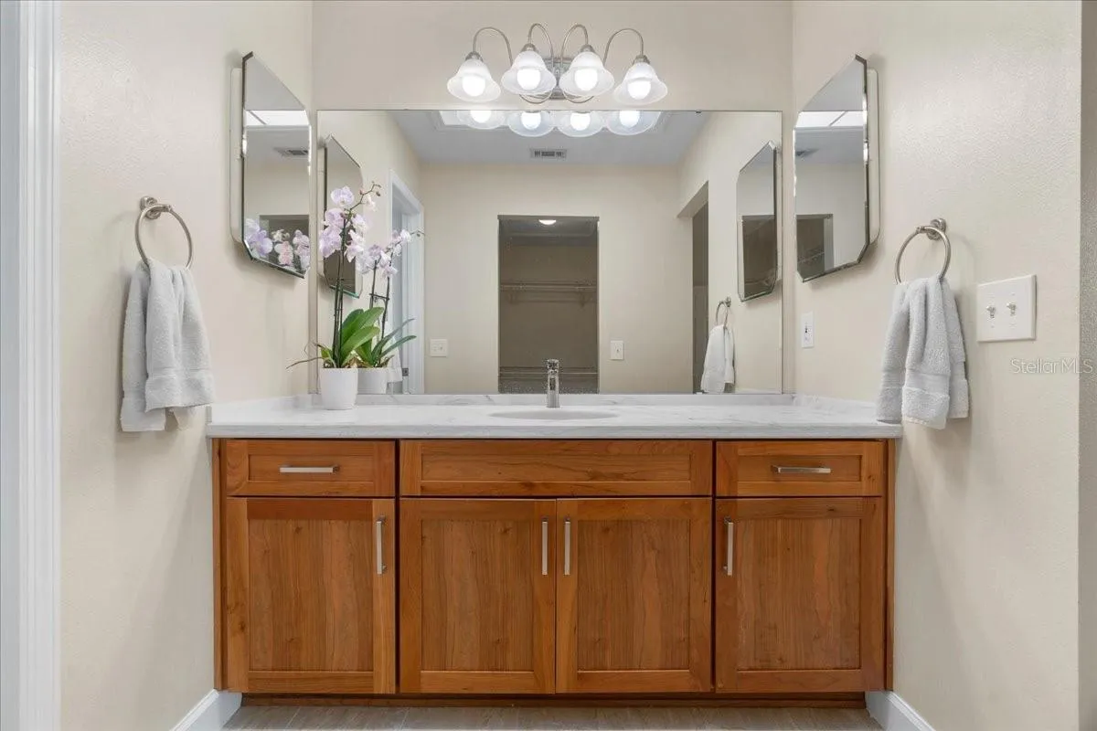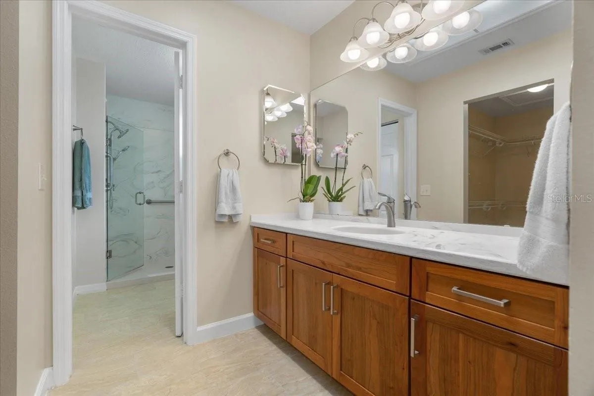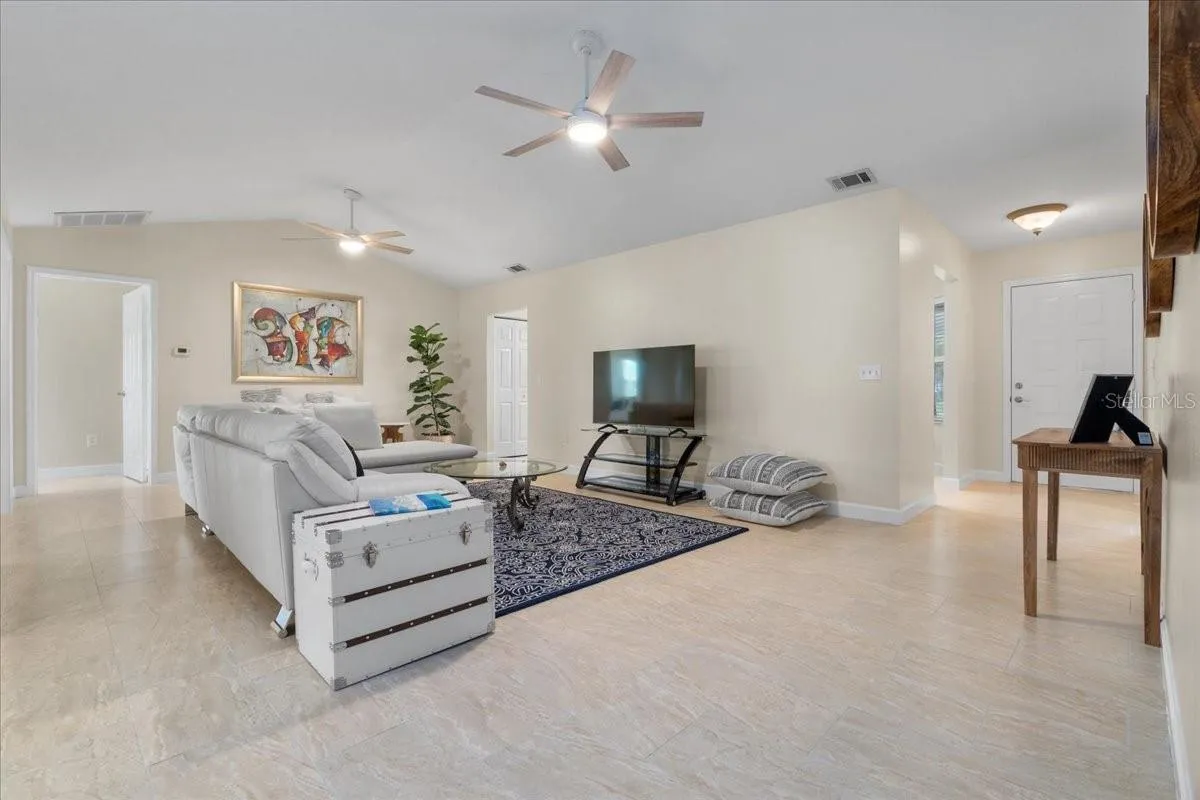 This home has been recently refreshed and ready for a new owner and quick closing. This 3-bedroom, 2 bath home includes a stunning kitchen with upgraded cabinetry, soft close features on the doors and drawers, lower slide out storage shelves, crown molding and granite counter tops. The kitchen includes a breakfast nook, 2 Pantries and a Bosch dishwasher. The floorplan features a large living room with vaulted ceiling, dining area and eat in kitchen.! The triple-split bedroom layout offers each bedroom privacy, and the 3 hall closets offers ample storage. The flooring is tile in the living areas with the bedrooms and dining area offering newly installed vinyl plank flooring. The enclosed lanai includes newer windows and air conditioning offering a formal dining room or additional entertaining space for game nights! This home includes front and rear screened enclosures. Recent interior improvements include both bathrooms being remodeled, Vinyl windows with storm covers, ceiling fans with remotes and interior paint. Exterior upgrades and improvements include New Roof in 2024, Vinyl windows in 2008, Screen room and patio slab in 2023. There is an oversized 2 Car Garage offering amply space for storage! Additional features include Leaf Filters on the gutters, irrigation system, garage service door, utility sink in the garage, insulated garage door and insulation in the ceiling of the garage. The back yard offers a park like setting overlooking the greenbelt area. Two minutes in the golf cart or a short walk and you will arrive at the amenities of Marion Landing. Amenities include bowling, swimming, exercise equipment, clubhouse activities and monthly social mixers! The monthly HOA fee includes all these amenities and your water and sewer. This is an active 55+ community in the heart of Southwest Ocala with excellent access to shopping, restaurants and medical facilities.