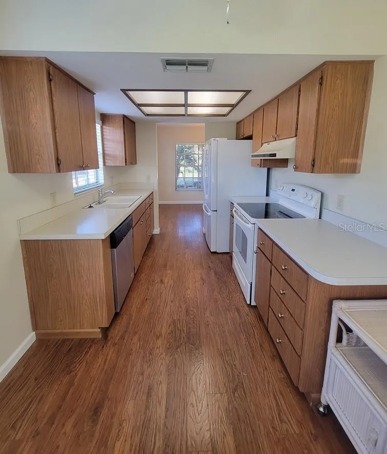 You’ll appreciate the abundant storage throughout, including walk-in closets in both bedrooms, additional interior closets, and exterior storage space. Flooring includes laminate and tile throughout, with carpet only in the guest bedroom. A covered parking spot is included, with guest parking conveniently close by.