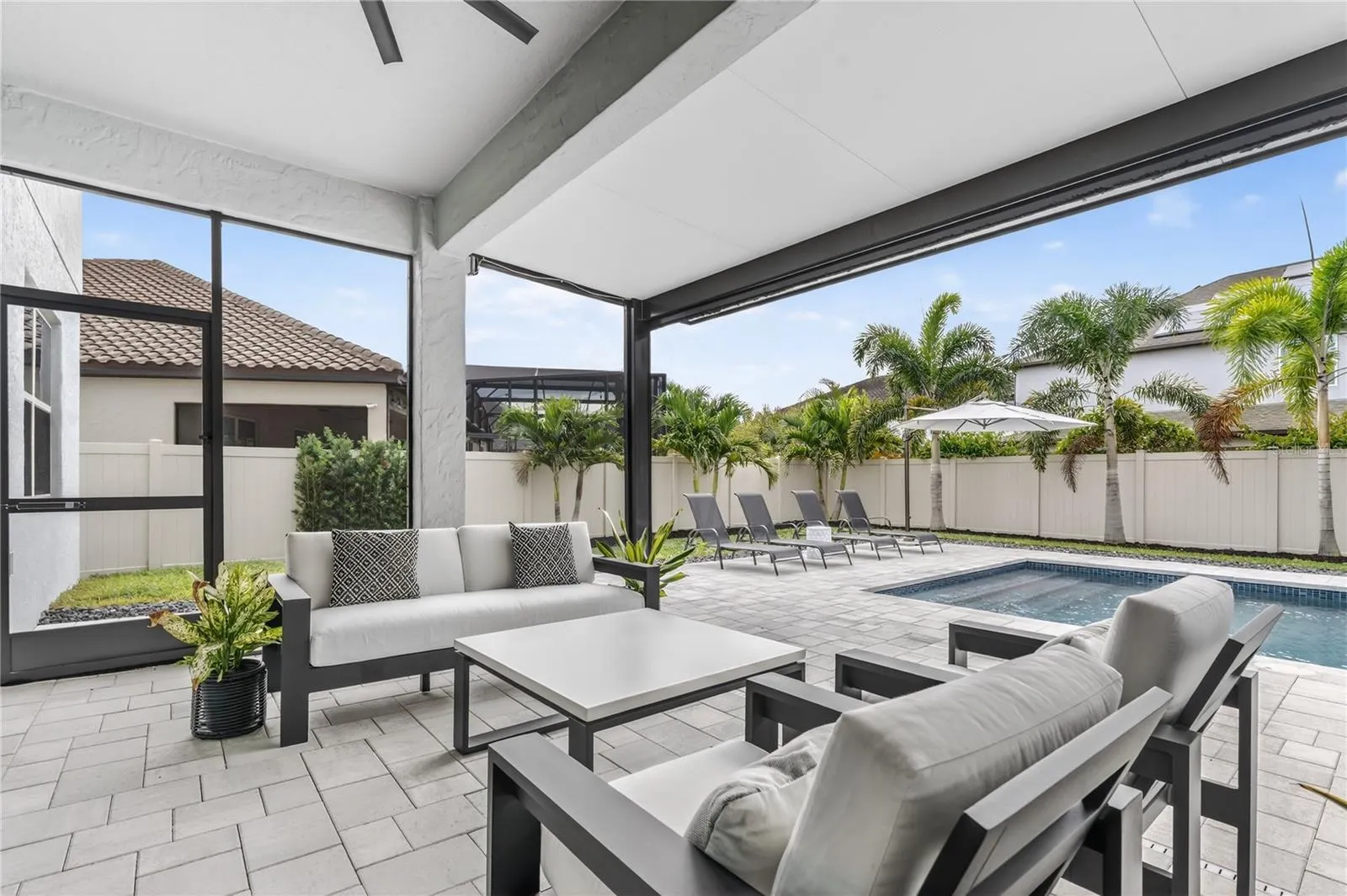 Outdoor living is a central focus. A private luxury pool anchors the fenced backyard, creating a serene retreat bordered by manicured landscaping. The covered lanai extends the living space outdoors, and with retractable screens, it becomes a comfortable setting for dining, lounging, or gathering in every season.