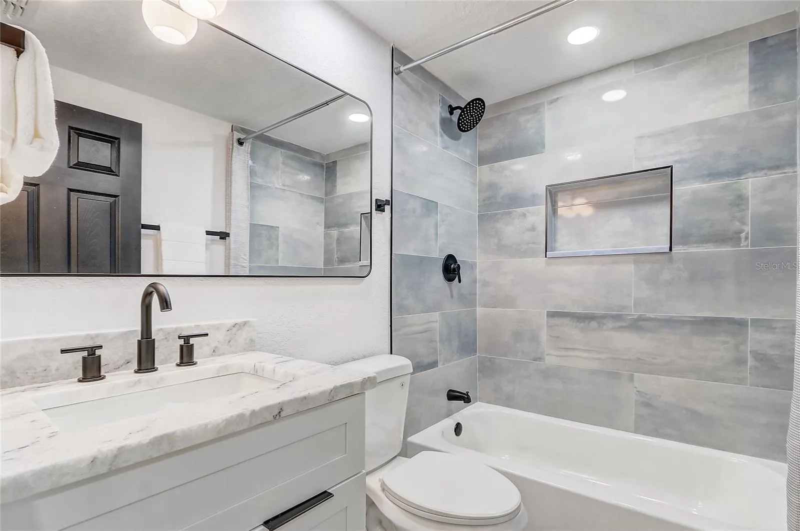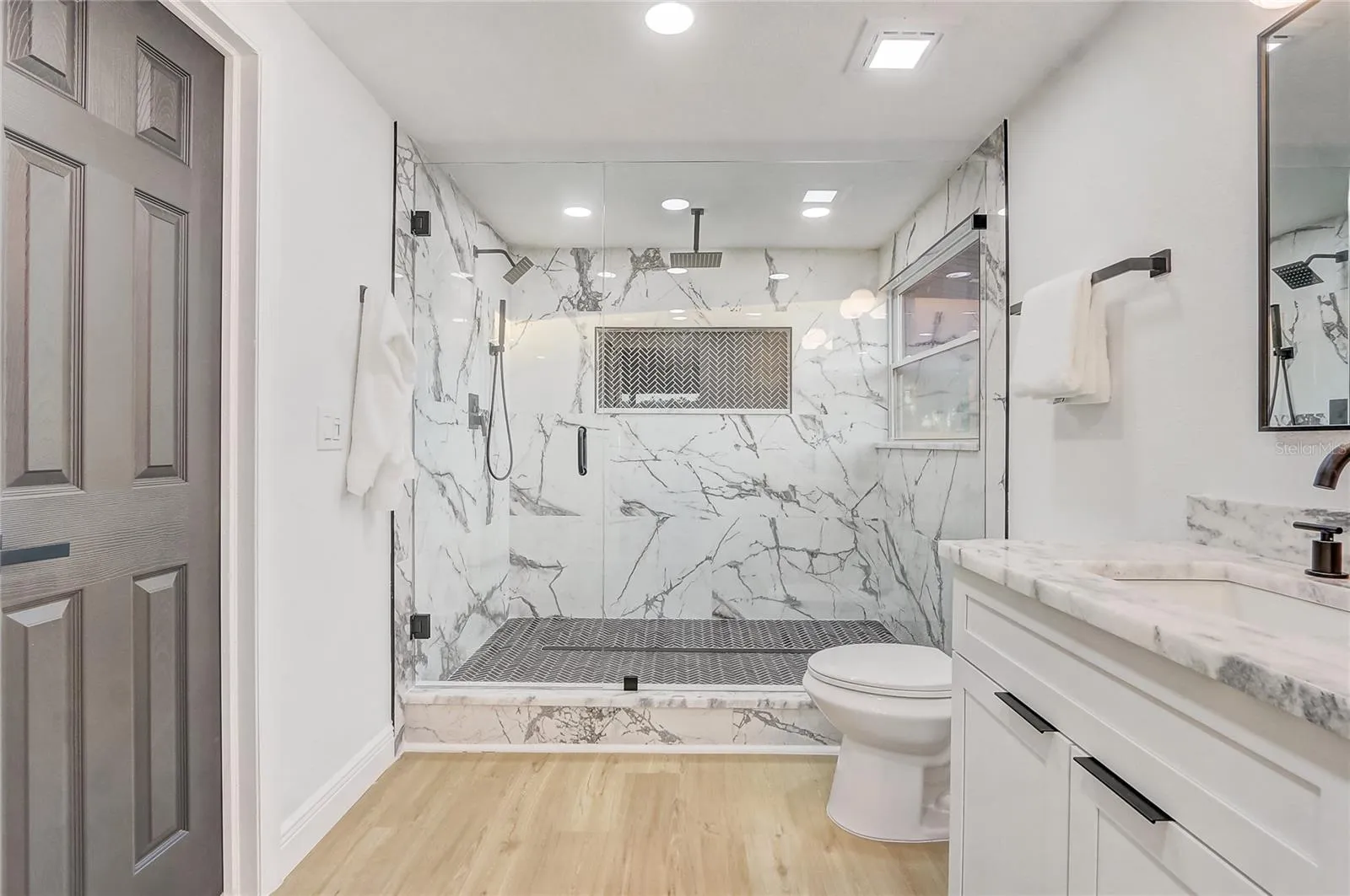 The custom kitchen is a showstopper, featuring all-new white shaker cabinets, new stainless steel appliances, and Panda Marble countertops throughout the kitchen and bathrooms, complemented by a seamless marble backsplash—perfectly blending style, function, and timeless elegance.
