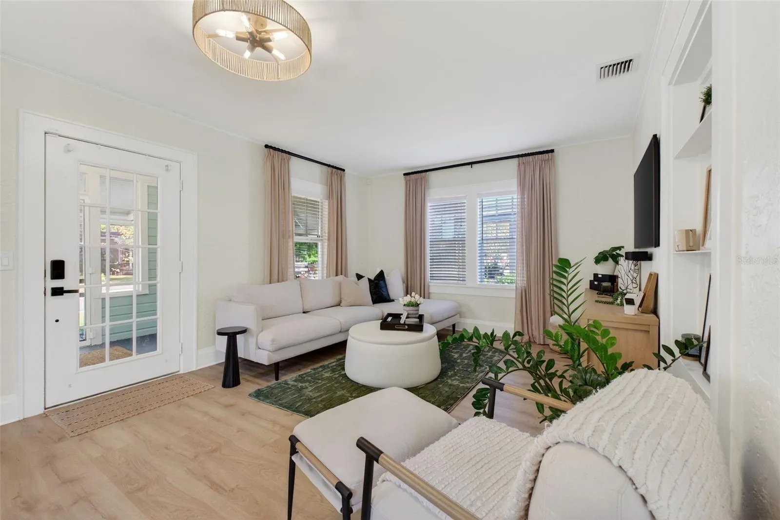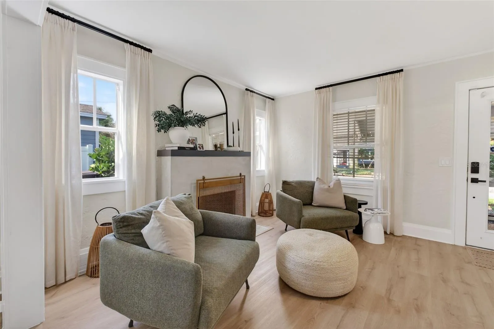 Inside, this charming 1920s bungalow—bursting with personality, sunshine, and thoughtful updates throughout! Inside, you’ll find a bright and welcoming living room centered around a beautifully refreshed FIREPLACE and hearth, perfect for cozy evenings or adding a touch of classic bungalow charm.