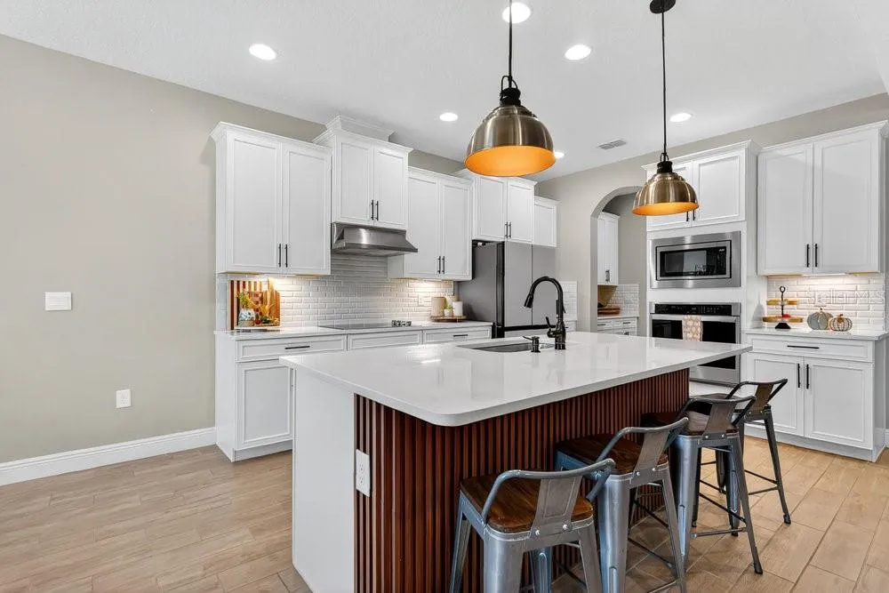 Just a few steps in, the space opens to a bright family room with an open-concept layout and a gourmet kitchen featuring modern 42-inch cabinets and an elegant backsplash. The butler’s pantry connects conveniently to the kitchen, and the dry bar extends your storage and serving space. The dining room offers serene views, while the family room opens to the covered lanai, perfect for cozy moments with family and friends.