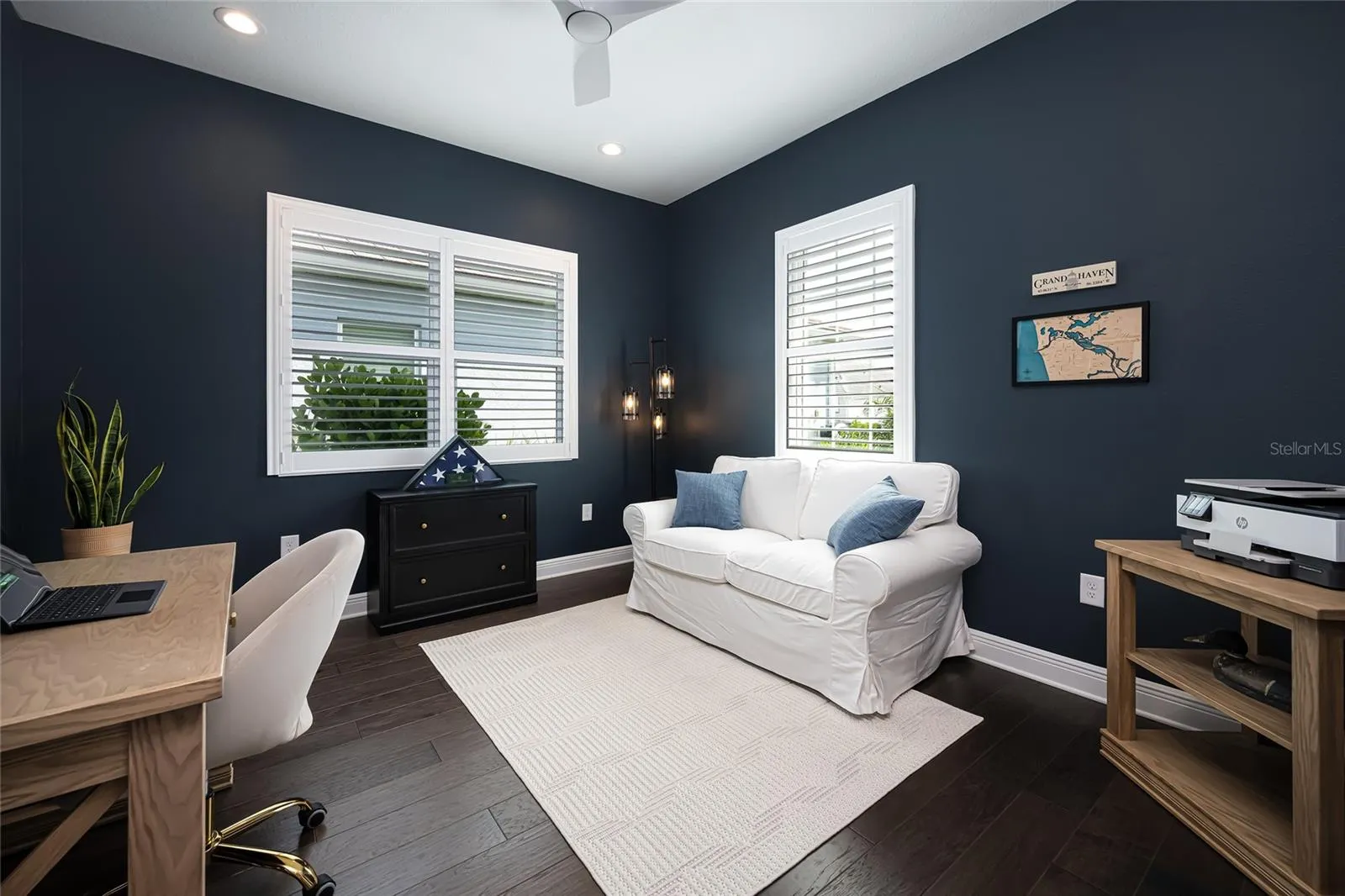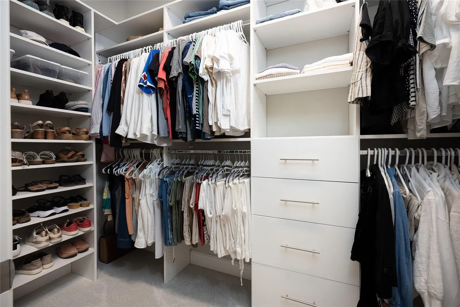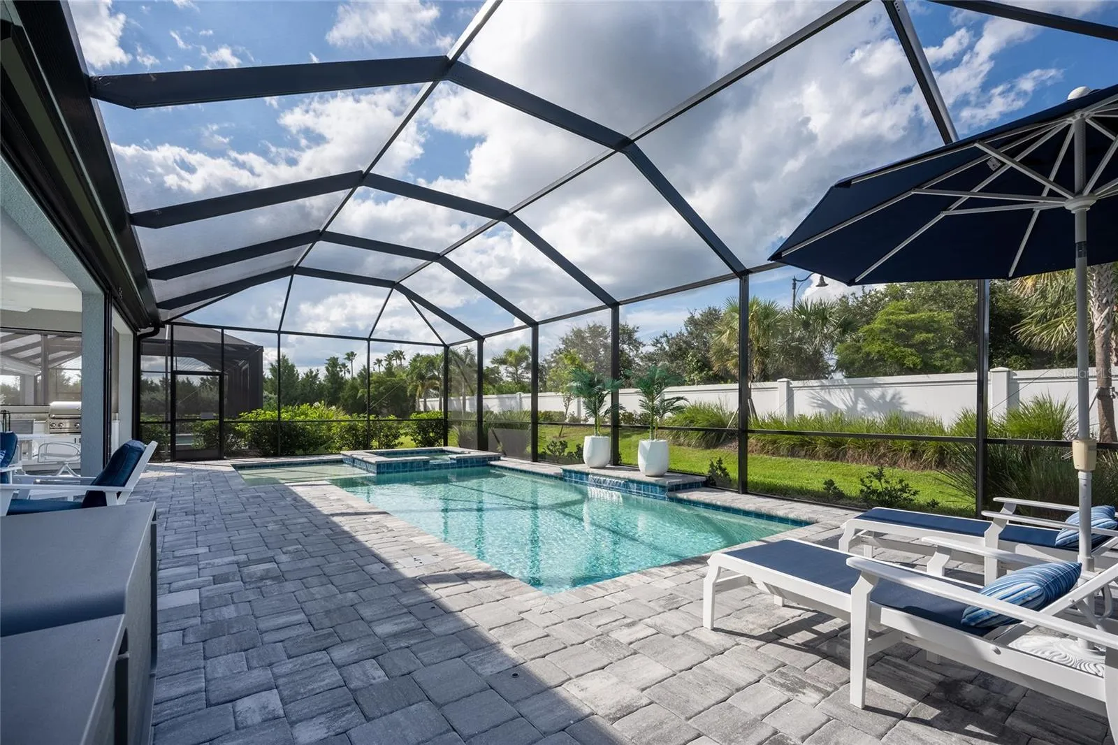 The backyard is a true paradise—complete with a heated in-ground pool with sun shelf, spa, and outdoor kitchen featuring a sink, beverage fridge, and a natural gas grill that never runs out. Relax on the lanai, and when you’re not there, the Storm Smart motorized shutters protect your outdoor furniture with the push of a button.