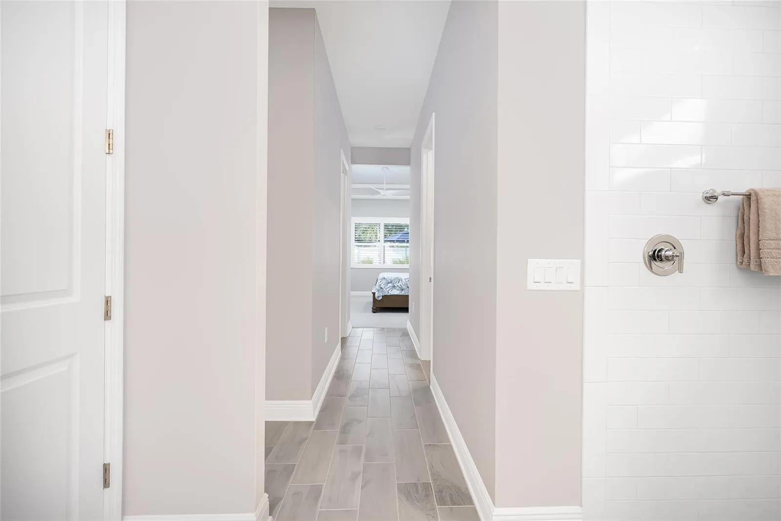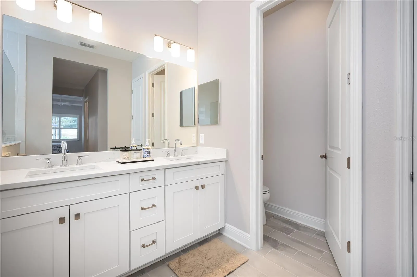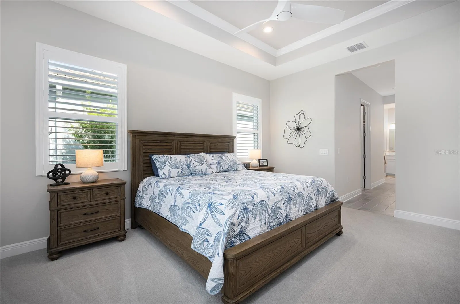 The primary suite is your private retreat, featuring hers and his walk-in closets and a bathroom featuring dual vanity and a large tiled walk-in shower. Plantation shutters, upgraded lighting, and thoughtful touches are found throughout the home.