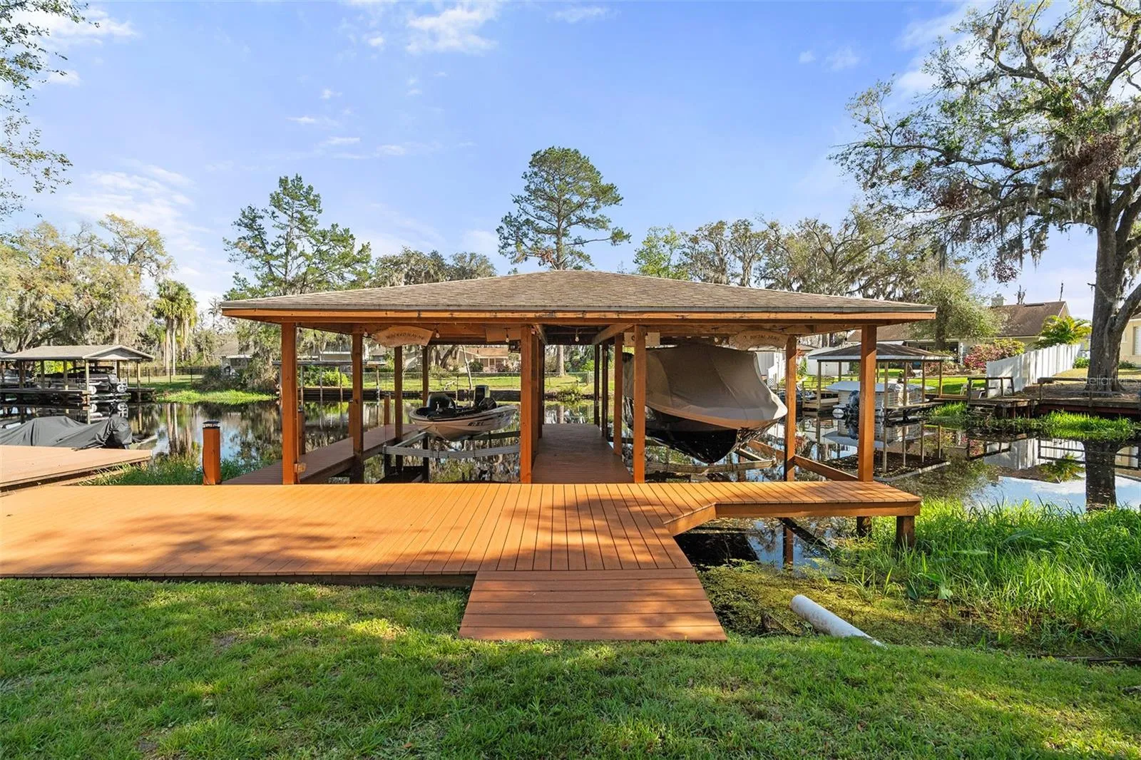 DIRECT CHAIN OF LAKES Home with NO HOA!! Experience waterfront living at its finest in this beautifully custom remodeled home with direct waterfront access to the Clermont Chain of Lakes. The large dock with new WearDeck Composite Decking features two boat slips, both with motorized cradle lifts. This 4 bedroom, 2.5 bathroom recently remodeled home is perfect for boating enthusiasts! The custom kitchen offers Miele and KitchenAid appliances, a 36 inch Monogram induction cooktop, and a spacious single-slab quartzite island. The primary suite offers a luxurious bathroom with an oversized shower for two with four separately valved showerheads, plus a custom-built closet. Plantation shutters add charm throughout the home. The walk-out basement includes two bedrooms, a full bath, laundry room, and a bonus room, while the main floor hosts the primary suite, powder room, living and dining areas, the kitchen, and an additional bedroom with a custom built-in desk and entertainment center. Enjoy the lake life with boating up to the number of restaurants on the chain after a day of water sports or a relaxing cruise taking in the views. Solar panels and solar hot water heater are PAID OFF. Lawn is irrigated from the lake, saving you from a large water bill. New septic drain field installed October 2020. Home has RV hookups and a concrete parking pad for your RV. A rare gem full of extras—schedule your showing today!
