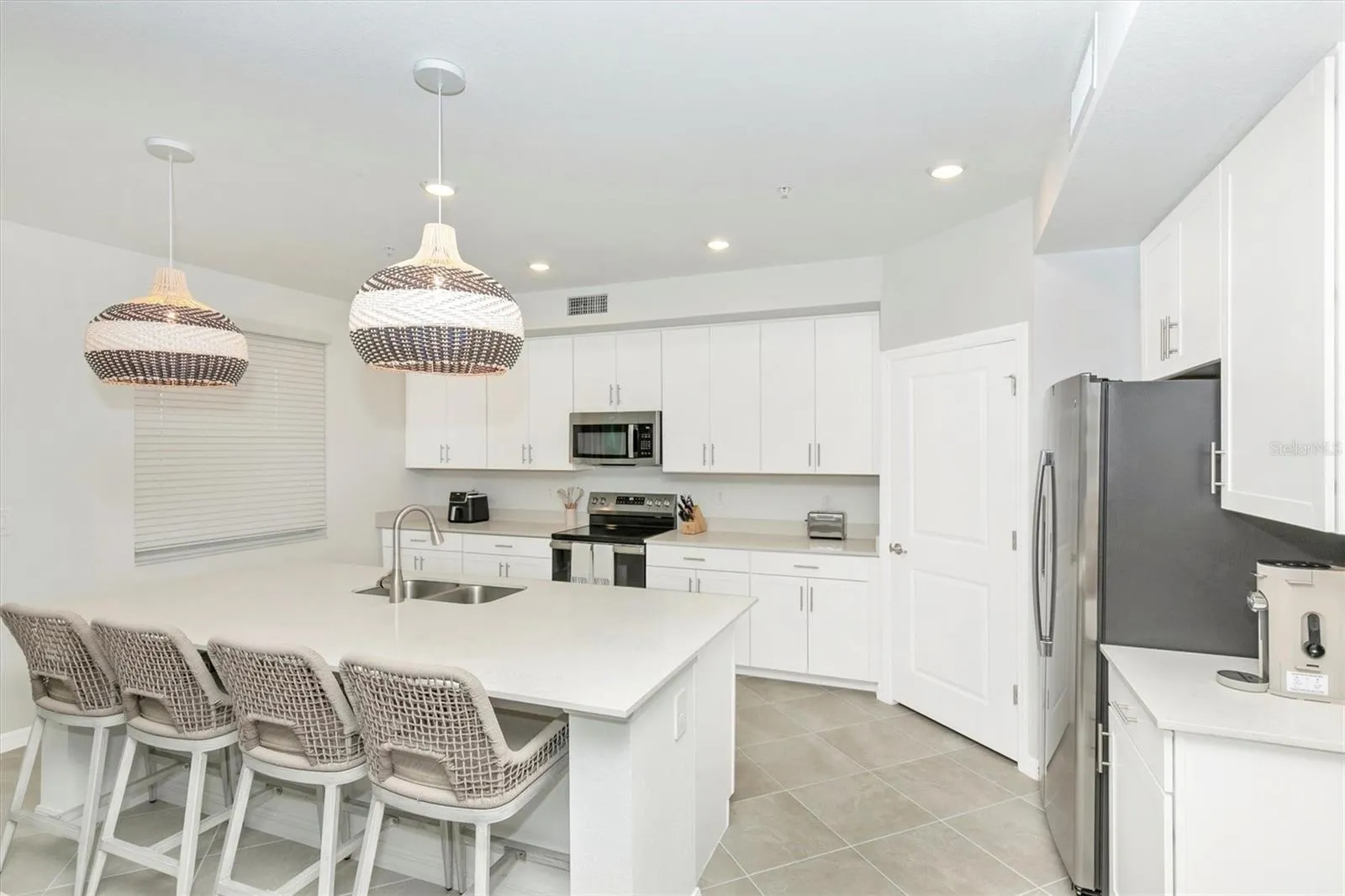 Modern kitchen with stainless steel appliances, quartz countertops, and large island