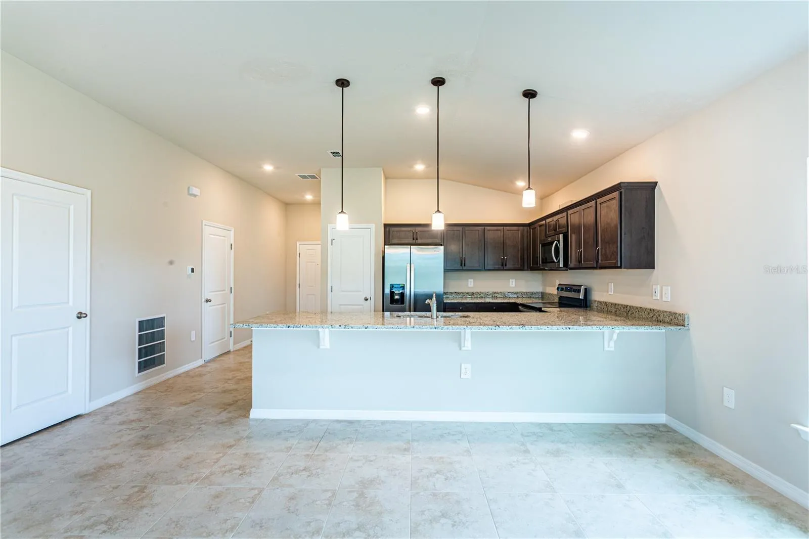 As you enter, a beautiful kitchen welcomes you, with an expansive, oversized bar that seamlessly flows into the living and dining area. The finesse of soft-close, Shaker Stained Basalt 30″ cabinets and upgraded Crema Pearl granite countertops add a functional touch of luxury to the kitchen. Kitchen upgrades include a Moen Integra chrome kitchen faucet, garbage disposal, and sleek stainless steel energy efficient appliances. This home exudes sophistication with a vaulted ceiling that unveils a spacious lanai, creating an indoor-outdoor haven. Additionally, Carpenter Homes provides an upgraded lighting package including Kemal Bronze pendants over the kitchen bar, and Oslo brushed nickel vanity fixtures in both bathrooms, accenting the overall lighting design. Brushed nickel finish ceiling fans in each bedroom, as well as the great room, helps to circulate air flow and keep you cool in the Florida weather. Complimenting the expansive living area is Magnisi 18×18” beige ceramic tile flooring.