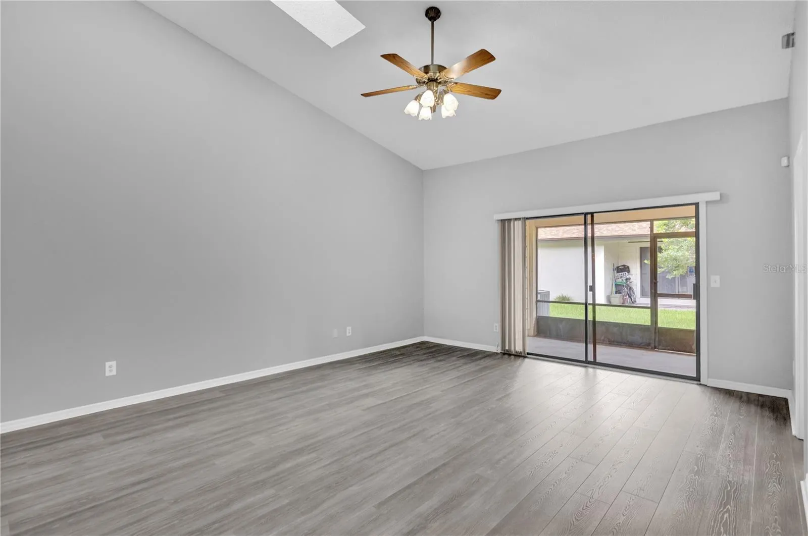 Enjoy peace of mind with a new roof (2023), new thermostat and fan (2024), and updated AC ducts and insulation (2023). The home features fresh paint, brand-new flooring, and two skylights in the living room that fill the space with natural light. Each room includes a ceiling fan for added comfort.