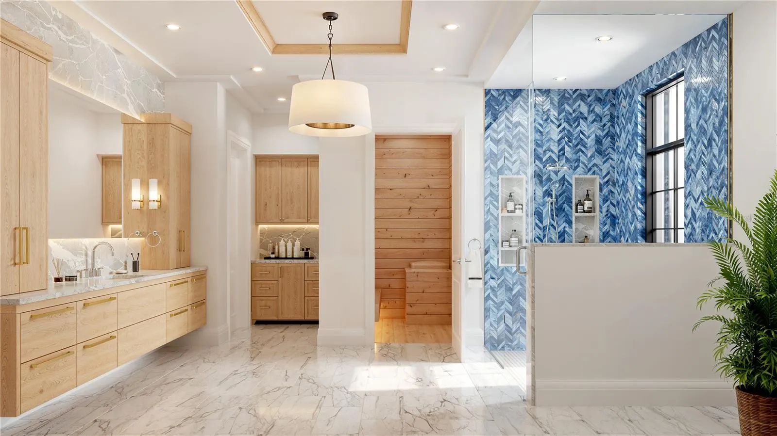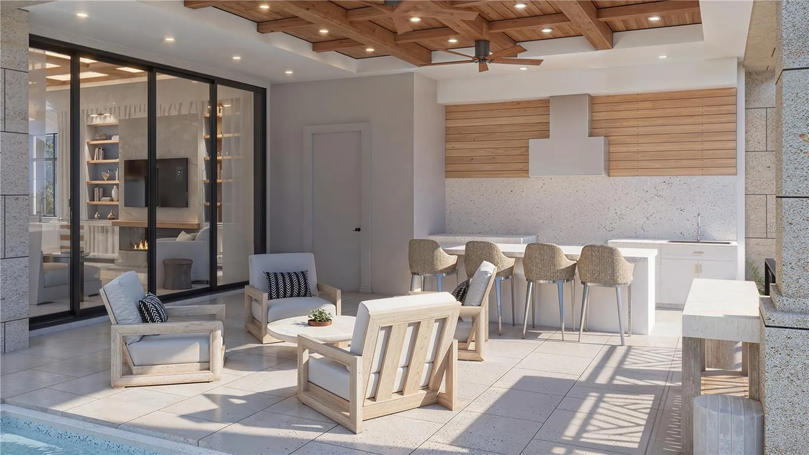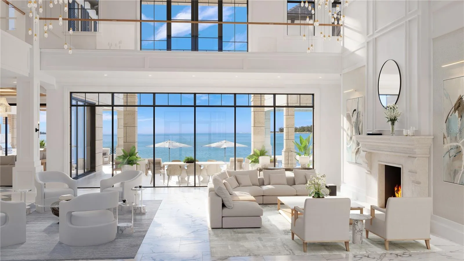 The great room, bathed in natural light, showcases floor-to-ceiling windows that frame breathtaking views of the turquoise Gulf waters. A reflecting pool with fountain features mirrors the beauty of the estate’s serene surroundings, while retractable glass walls blur the lines between indoor comfort and outdoor splendor. The gourmet kitchen is a culinary dream, outfitted with custom cabinetry, designer hardware, and state-of-the-art appliances, including an oversized island ideal for both entertaining and everyday living.