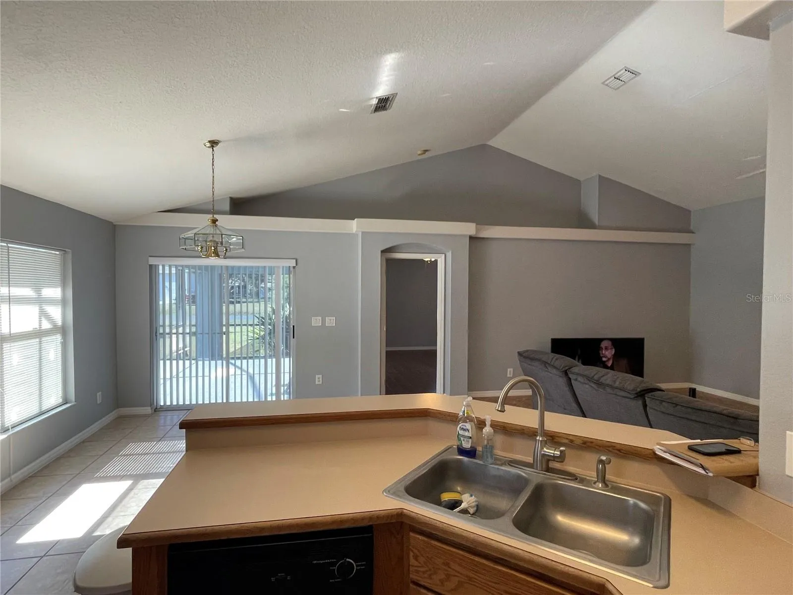 Step inside to discover a bright, open layout with vaulted ceilings, a spacious living room, and seamless flow into the kitchen and dining area. Enjoy easy-care laminate and tile flooring throughout, with cozy carpet in the bedrooms. French doors open to your private screened-in pool featuring a peaceful waterfall, perfect for relaxing or hosting guests.