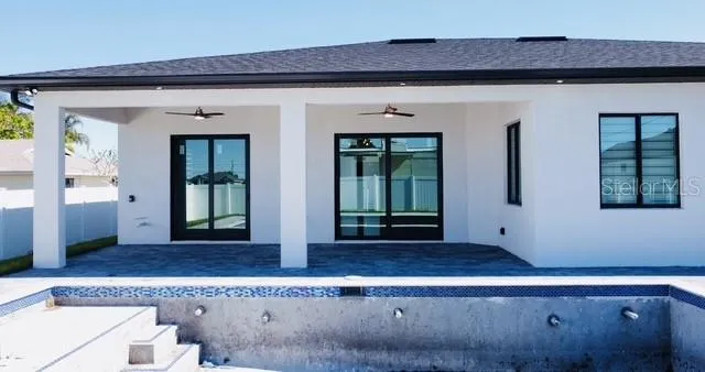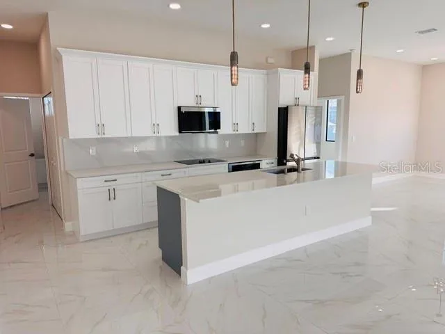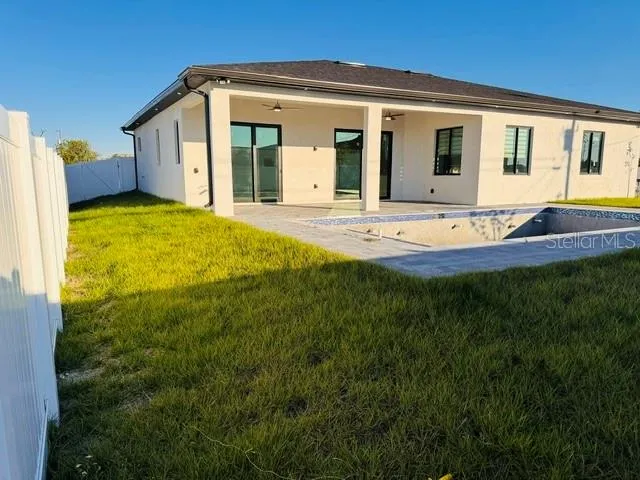 Stunning new construction pool home located in a quiet neighborhood close to all amenities. This fabulous home features 3 bed + den/office, 2 bath, 3 car garage, an in ground 14 x 28 upgraded pool with natural stone travertine coping, interior tile, tanning ledge with bubbler, and a fenced yard. Enter the house through double entrance doors into the large and bright living area with 96” tall sliding doors to the lanai. This home features hurricane impact doors and windows and extra tall ceilings that complement all extended 96” exterior doors and 32”X32” porcelain tile throughout the house. Kitchen features premium cabinets with solid wood doors, a large island with room for seating, upgraded stainless steel appliances with a built in cooktop, and premium quartz counter tops. A separate dining area overlooks the gorgeous pool. Upgraded fixtures, ceiling fans and lighting throughout this home. Primary suite has two walk in closets with custom organizers, dual sinks, large glass enclosed shower, oversized freestanding tub, and sliding doors out to the lanai. The two additional bedrooms have custom closet organizers and window treatments. Garage has two garage door openers. Exterior has decorative stucco finish, extended paver driveway, High efficiency premium Ruud HVAC system, and a sprinkler system.
