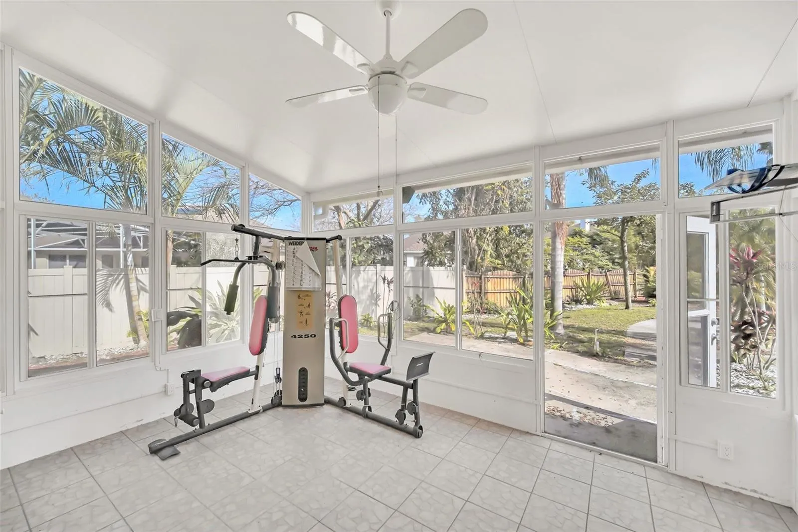 The extended, screened-in patio with elegant tile flooring offers an ideal space for both relaxation and entertaining, overlooking a one-of-a-kind garden complete with a unique walkway that leads to a stunning fountain. Adjacent to the patio, a versatile sunroom provides additional space for a home gym, extra seating, or a cozy reading nook.