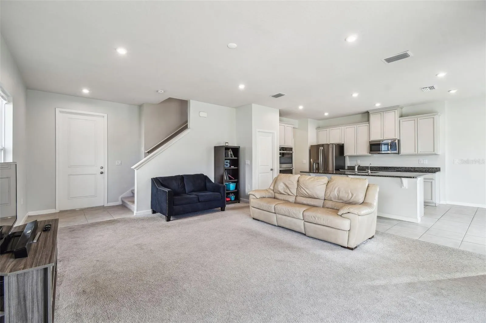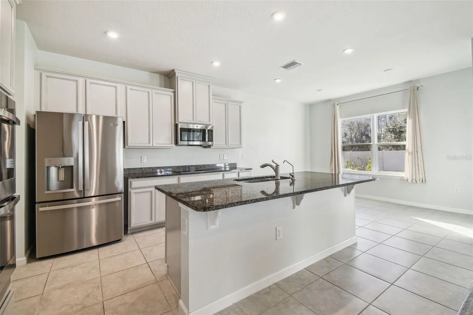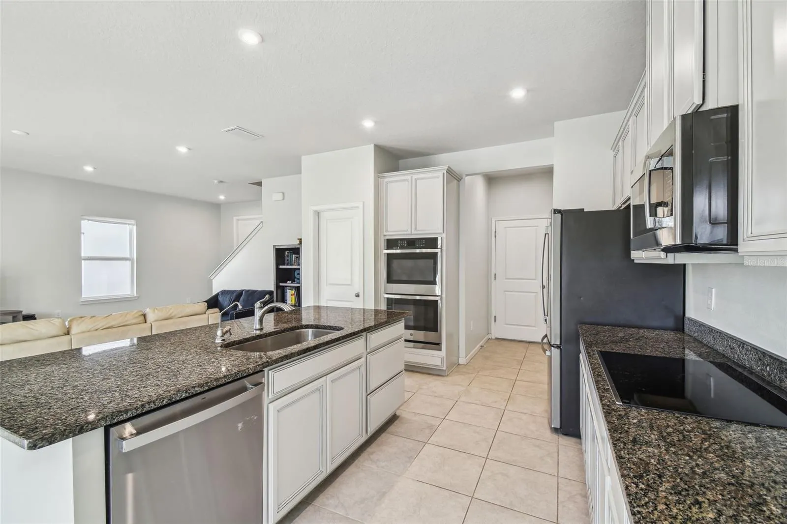 Upon entering, you’ll be greeted by a spacious, open floor plan designed for both functionality and comfort. The heart of the home—the living room and kitchen combination—offers a versatile space ideal for daily living and entertaining. The kitchen is a chef’s delight, featuring upgraded granite countertops, a large island, a sleek glass cooktop, a double wall oven, stainless steel appliances, and abundant cabinet storage, plus a generous walk-in pantry. The adjacent dining area, framed by large windows, floods the space with natural light.