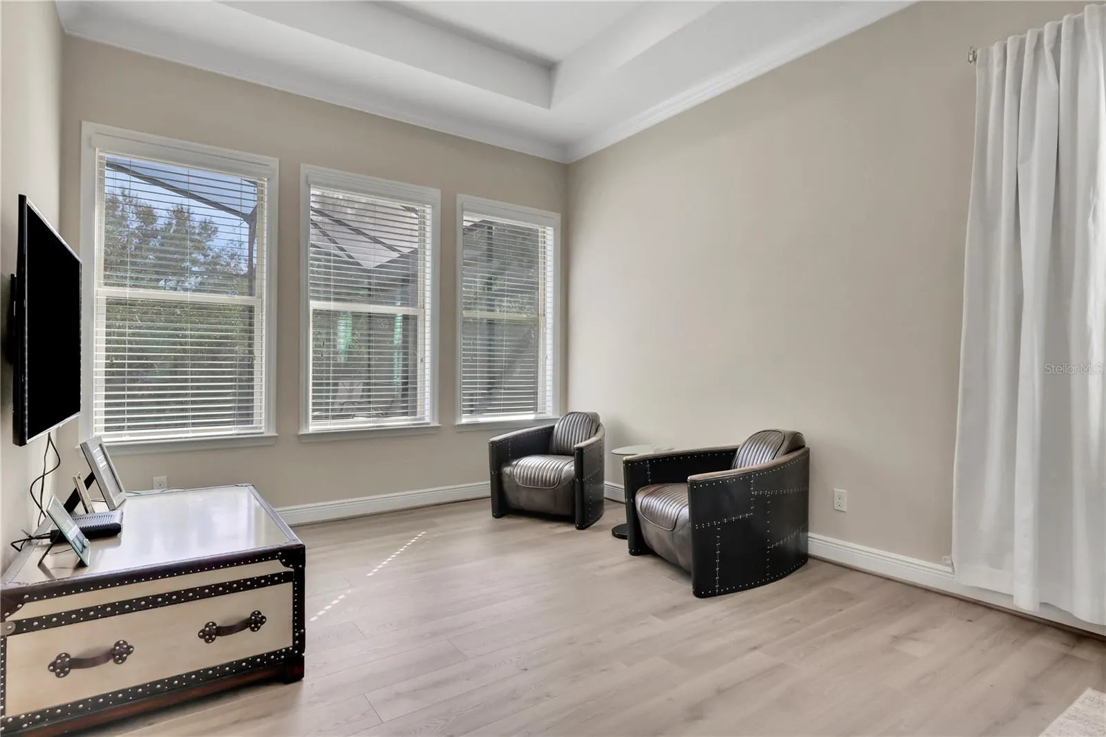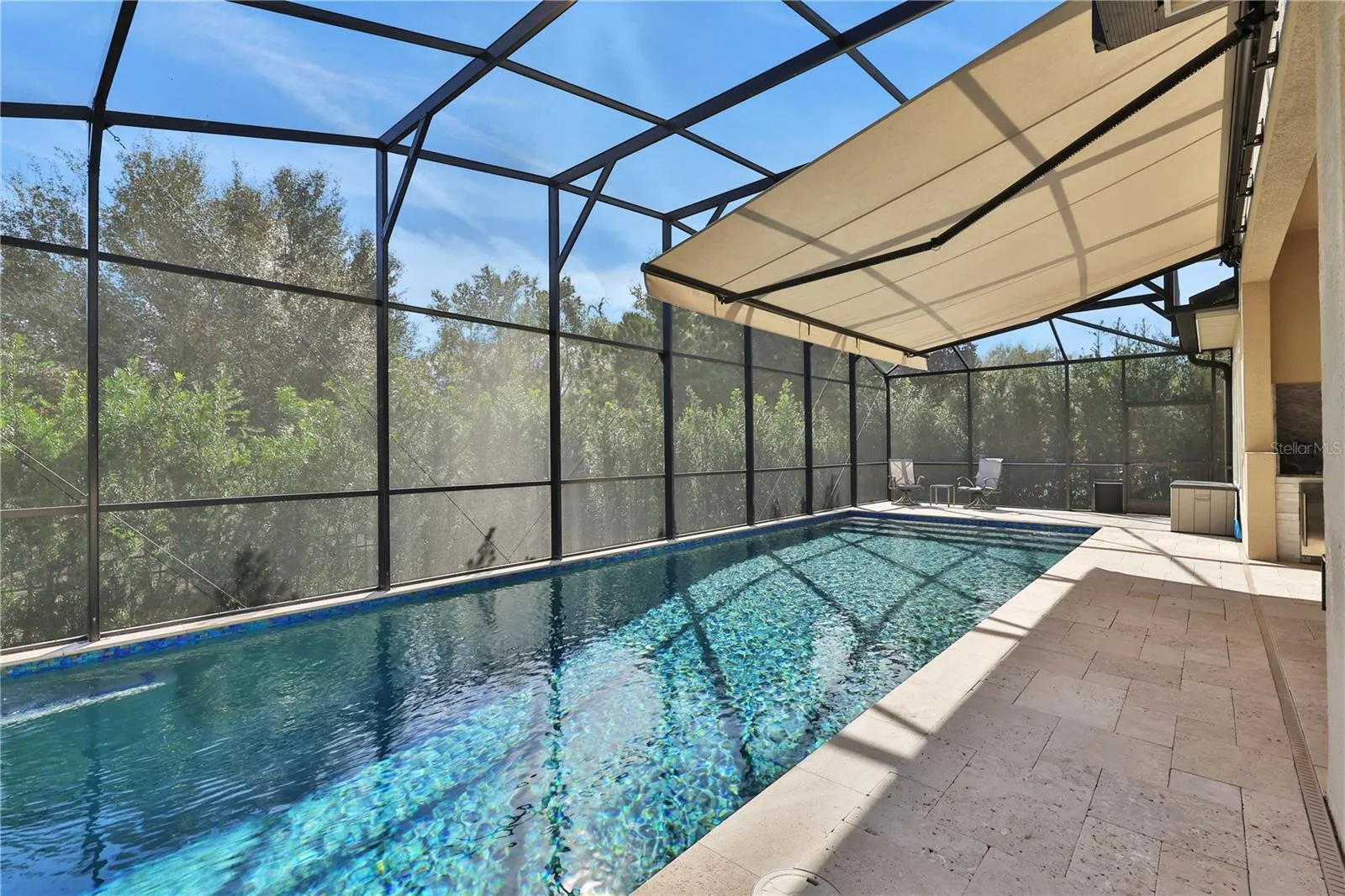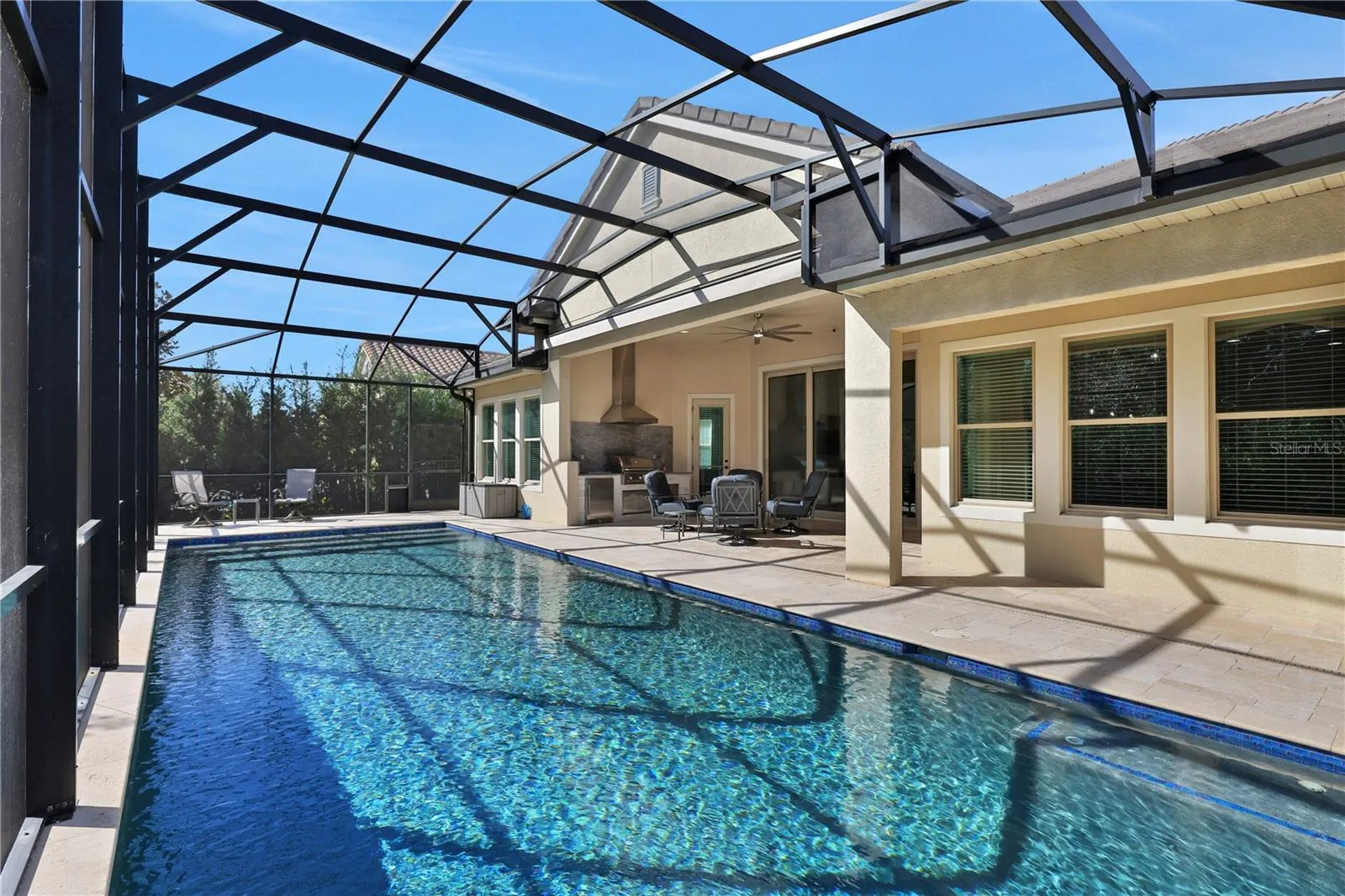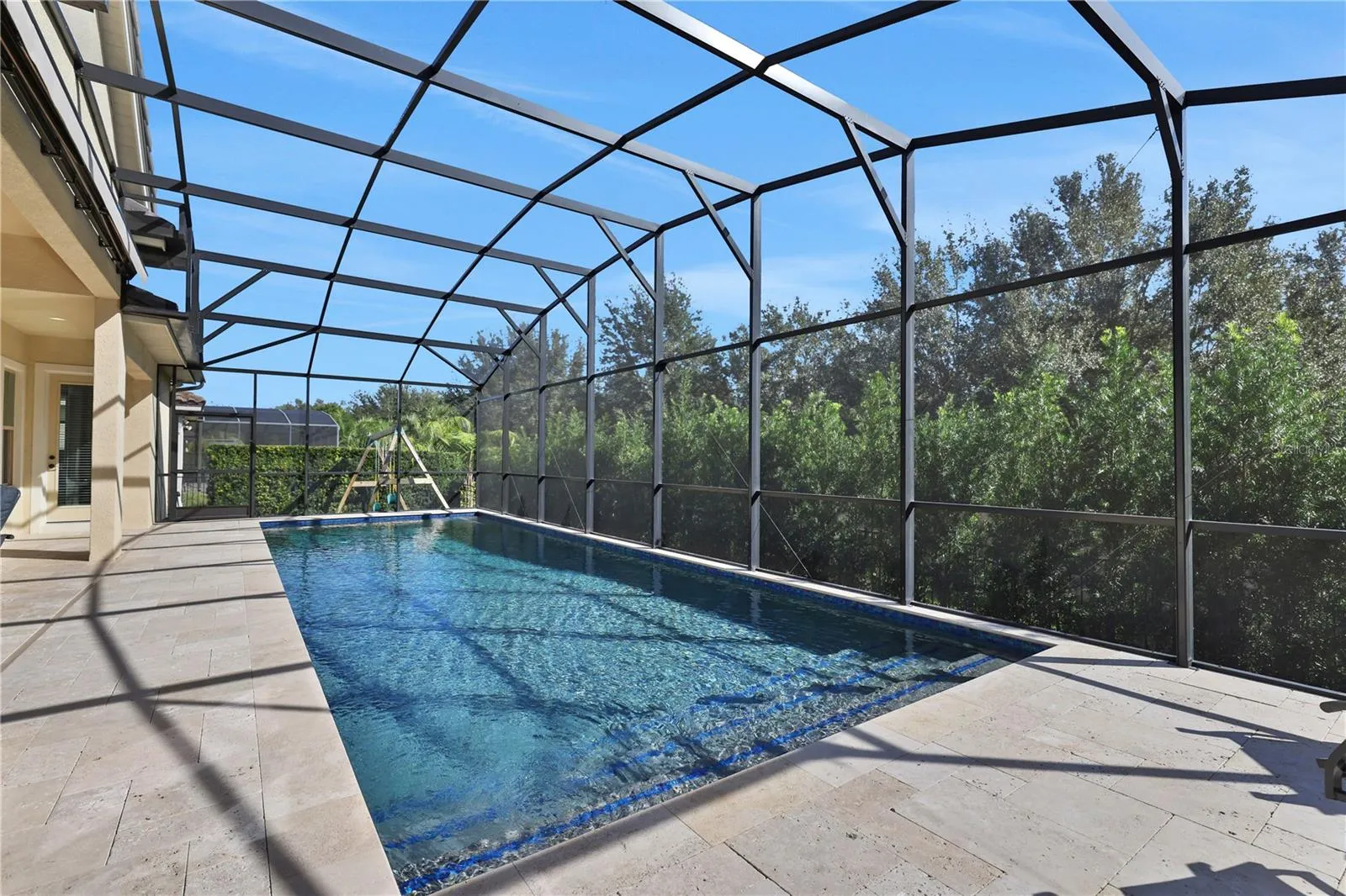 Immaculate one-level “Monte Carlo” floor plan with 40′ HEATED pool nestled in gated Steeple Chase, built in 2018. Why wait to build when this better-than-new 4 bed, 4 bath home complete with office and flex space with NO REAR NEIGHBOR and incredible privacy is ready for you right now – all with energy-efficient construction and materials. Arrive at a brick paver circular drive affording ample parking when you need it, as well as an elegant elevation giving this home major curb appeal. With its incredible versatility, this home gives you the option of two separate screened-in outdoor areas to enjoy – the front courtyard with brick pavers is fully screened in and offers a cozy and private outdoor space to gather with friends and family, while the astonishing 40′ saltwater heated pool in the backyard is framed in with an oversized screen enclosure and features incredible privacy with no rear neighbors. The covered rear entertainment area boasts travertine pavers surrounding the pool and under the covered lanai, as well as a brand-new summer kitchen with refrigerator, and a BRAND NEW electric shade with LED light! Soaring ceilings along with an open design concept make Taylor Morrison’s “Monte Carlo” an award-winning floorplan, and it’s evident why. 10′ sliding doors insulate the home from sound and the elements alike, while the electronic shades let the light in when you want it. The chef’s kitchen showcases an oversized center island with space for the family, as well as a 42″ built-in Monogram refrigerator, Monogram oven, natural gas cooktop, microwave/convection combo, AND built-in custom ice maker ideal for entertaining. The master suite is a destination unto itself privately tucked away, and features dual vanities in the spa- like master bath, custom closet systems in the oversized walk-in closet, and even a sitting area overlooking the pool and private rear. A guest suite is privately situated near the front of the home and has its very own ensuite full bath and walk-in closet. The oversized laundry room has copious storage; a theme echoed throughout the entire house. Truly too much to list; a must-see! Steeple Chase is among Central Florida’s premier new home communities with a strong sense of presence that begins at the landscaped, gated entry. Mature trees, site ponds, views of Lake Linden, and pocket parks throughout the community create a naturally serene setting. Residents will have direct access to the Seminole Wekiva Trail, a 14-mile paved recreational trail that is part of the Florida National Scenic Trail. Nearby employment centers include the Lake Mary business corridor, two miles from the community, along with many national and international firms including Mitsubishi, AT&T, and Chase. The community is served by a number of leisure and entertainment venues such as Colonial Town Park and Park Place at Heathrow, which boast trendy eateries, boutiques, a Publix supermarket, a movie theater, as well as essential services. This property may be under audio/visual surveillance.