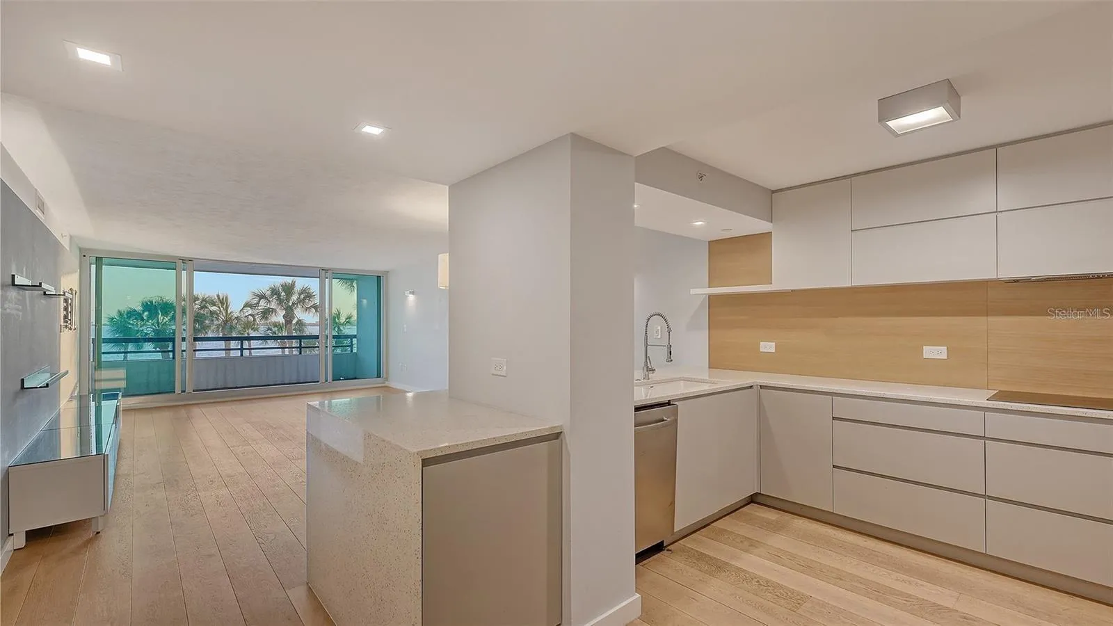 One or more photo(s) has been virtually staged. Direct Bayfront living in the heart of Sarasota at Condo on the Bay. This fully renovated 2 bed/2 bath residence features beautiful panoramic views of the Sarasota Bayfront with breathtaking sunsets over LBK and Ringling Bridge. Step into the inviting Great Room – greeted by a wall of impact glass floor-to-ceiling sliding doors that seamlessly blend the outdoors in, opening to a spacious balcony overlooking one of two residents pools, just steps from one of the long piers and boat slips. Interior features include White Oak engineered hardwood flooring flowing throughout the Main Living space, complemented by custom built-in cabinetry and a dry bar with a wine refrigerator for easy entertaining. A chef’s delight, the modern kitchen features Elite Woodwork of Sarasota Cabinetry, stainless steel appliances including an induction cooktop and built-in wall oven and microwave, quartz countertops, Walnut wood backsplash, built-in pantry, and breakfast bar for casual dining. A conveniently located laundry closet with full-size stackable front-loading washer and dryer completes the kitchen. A true oasis, the master suite has serene water views, remote controlled Hunter Douglas shades, and plenty of storage space with a large walk-in customized closet plus a full entry wall of built-in cabinetry. The updated en-suite bathroom features dual floating vanities, modern floor-to-ceiling tile, a walk-in shower with frameless glass enclosure and multiple shower heads. The generously sized secondary bedroom boasts double built-in closets and a secondary bathroom with a floating vanity, walk-in shower with a frameless glass enclosure, and a built-in linen closet. New Ruud A/C in March 2023. Set directly on Sarasota Bay, the highly sought after community offers a lifestyle of sophistication and serenity. A range of amenities include staffed 24-hour security gated guardhouse, “sky lobbies” located on a number of floors throughout, two resort-style pools overlooking the bay, two fitness centers, tennis courts, pickleball courts, concierge services and boat/kayak docks with a fishing pier. This pet-friendly Tower II residence includes one assigned under-building parking space with secure access and storage. Just steps away from Sarasota Bay Park and the vibrant culture and arts scene of Downtown Sarasota, world-class dining, shopping and entertainment. A short drive to St. Armand’s Circle and Lido Beach. Don’t wait – it is time to experience a luxurious urban life from the 3rd floor of Tower II, in the Bayfront heart of Downtown Sarasota!