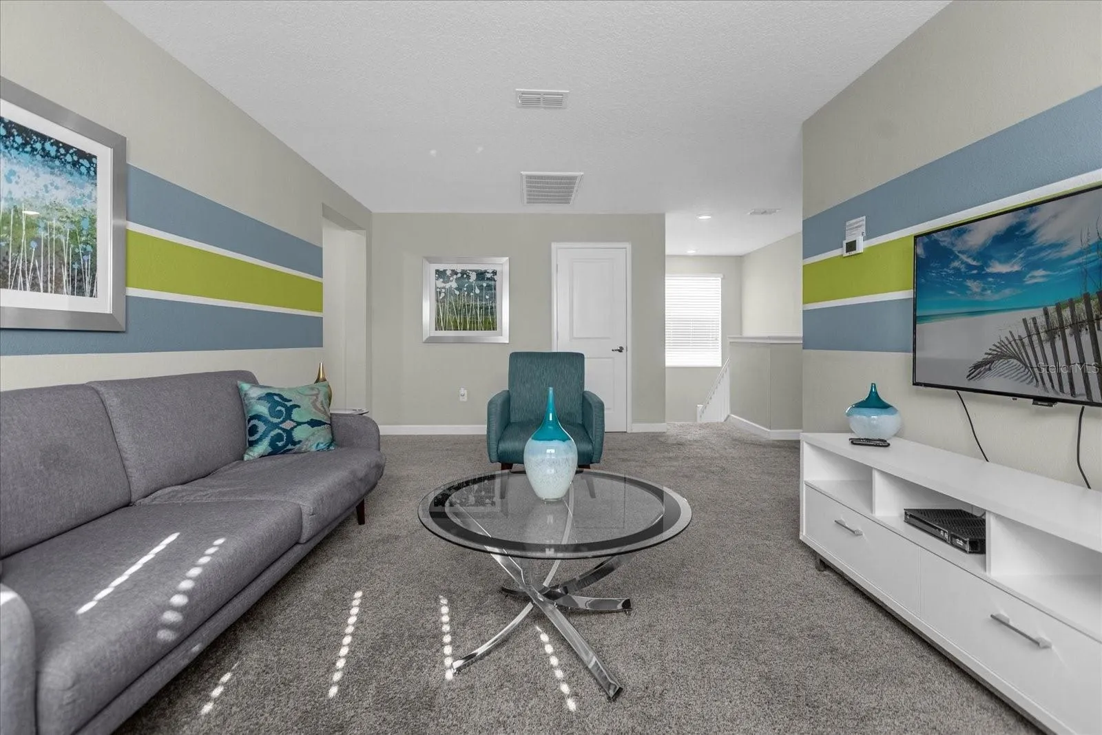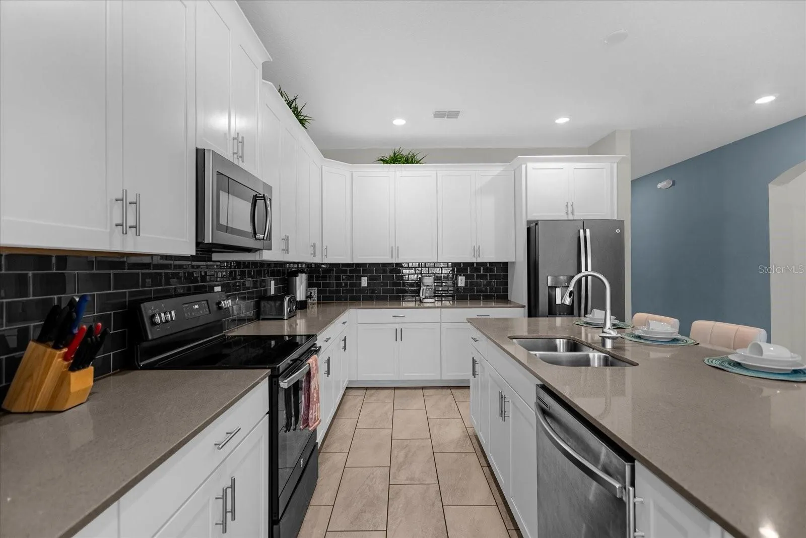 This two-story house comes with a clean white facade and tiled roof. The paves driveway leads to a single-car garage. The spacious open-concept layout with a modern kitchen featuring white cabinets, a black backsplash, and stainless steel appliances. The kitchen island includes seating with sleek barstools. Adjacent is a bright dining area with a large table and chairs, complemented by wide windows and sliding glass doors leading to the backyard. The screened-in private pool with a connected spa, surrounded by a concrete deck. This property appears to be ideal for modern living, with a focus on comfort, style and outdoor leisure.