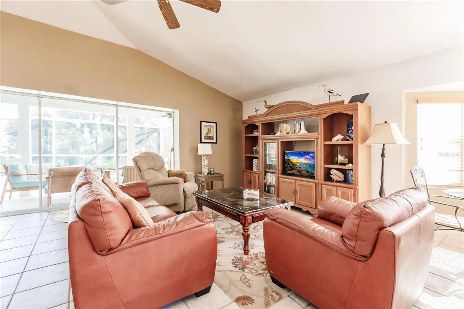 A screened front porch and foyer entry welcome you into a space with soaring 12-foot vaulted ceilings and stylish tile flooring. The architectural shelving, along with can, pendant, and track lighting, adds a modern touch. You’ll be drawn to a wall of sliding glass doors that lead to a spacious screened lanai and pool deck, which measures over 38 feet in length. Additionally, there is a covered seating area that measures 24 feet by 8 feet. This private retreat features a spa that overlooks a tropical picturesque green space, a rare find among homes in the area.