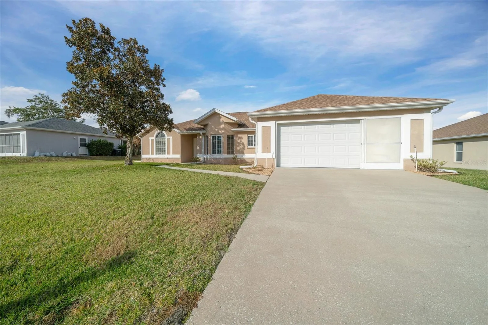 WELCOME TO 55+ GATED OCALA PALMS GOLF COMMUNITY IN NW OCALA! Highly desirable, sought after, well maintained concrete block stucco 2 Bedroom 2 Bath split plan home with 2 car garage. Ideal home makes for quiet and serenity. Home has incredible backyard views to the golf course. Home features open floor plan, newer HVAC, Roof in 2015, large open kitchen with extra cabinets and closet pantry, electric range, microwave, refrigerator, dishwasher. Inside Laundry Room with deep sink and plenty of storage. Enjoy your morning coffee in the enclosed Lanai overlooking the 6th green. A Home Inspection was completed. Ocala Palms comes with an incredible club house, tennis and shuffleboard courts, swimming pool as well as a top-of-the-line golf course. All for a low monthly HOA fee. This home comes fully furnished. Close and convenient to area stores, shops, restaurants, fitness facilities, and the World Equestrian Center. This home is Move In -Ready for you! Seller is Motivated. Your winter dream home awaits you. PRICED REDUCED!