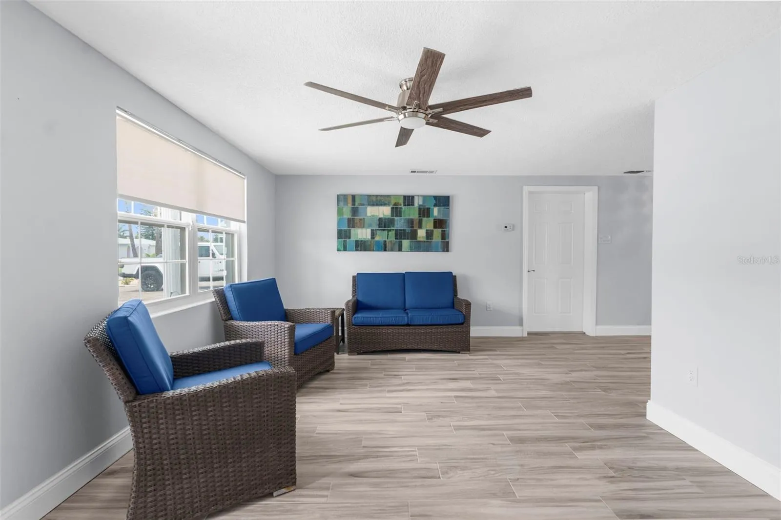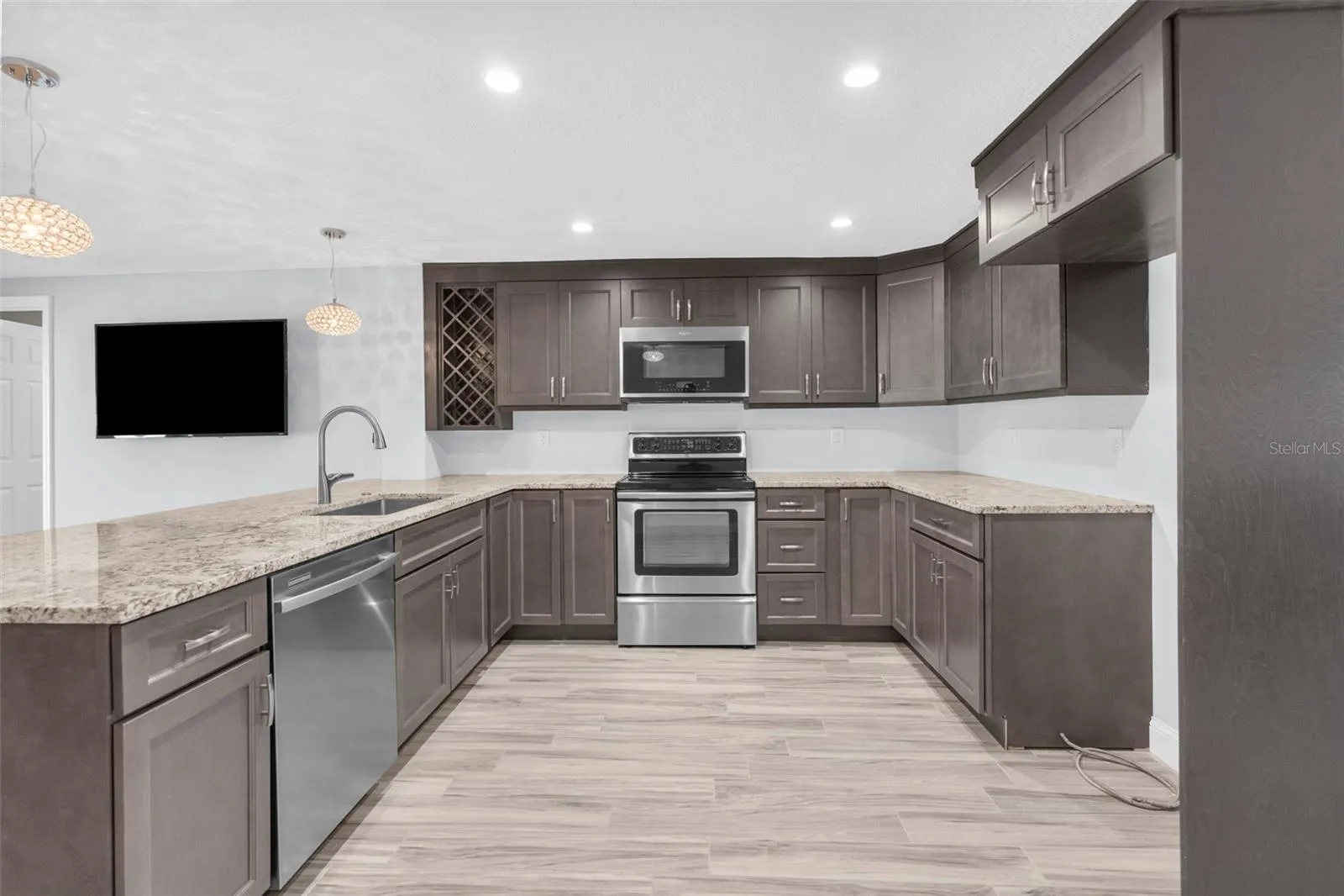 large covered patio, outdoor shower, outdoor stainless steel sink, and so much room to entertain. The exterior has minimal grass, so weekends are spent on the water instead of doing yard work. There are also 2 sheds in the backyard for additional storage for fishing rods, coolers, you name it! This home is spacious with updated light fixtures throughout, Softclose kitchen cabinets with a large lazy susan, granite countertops and appliances are only a fewyears old. The woodlike tile is carried throughout the home, no mismatched flooring