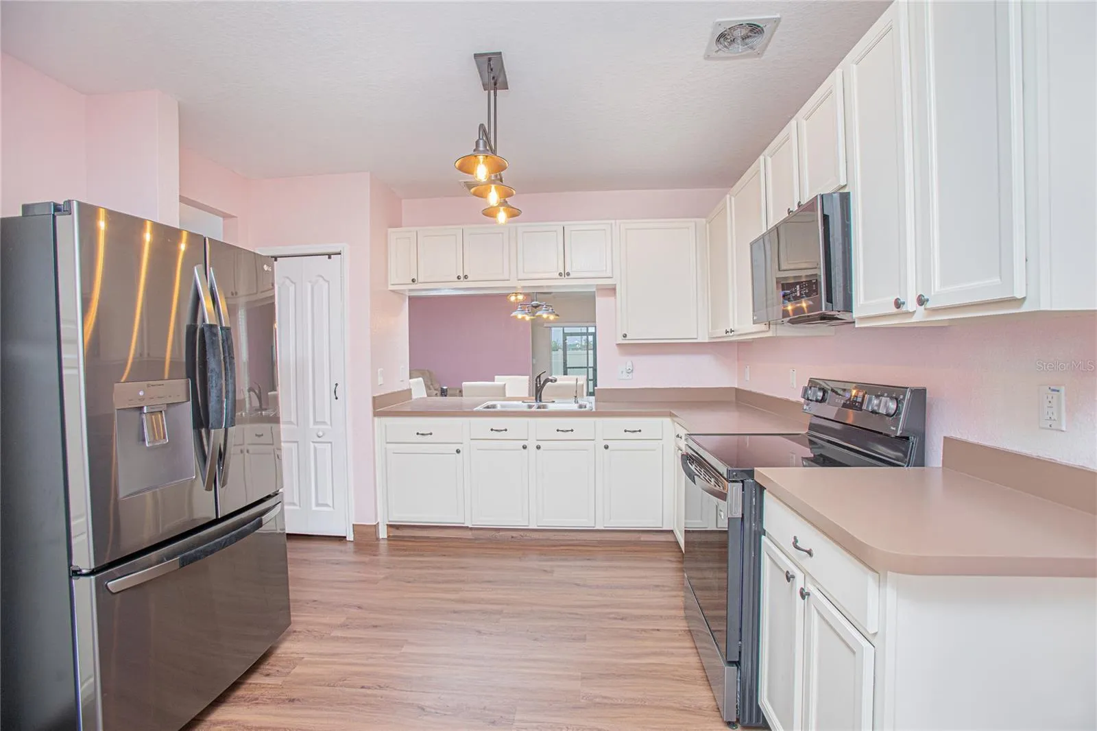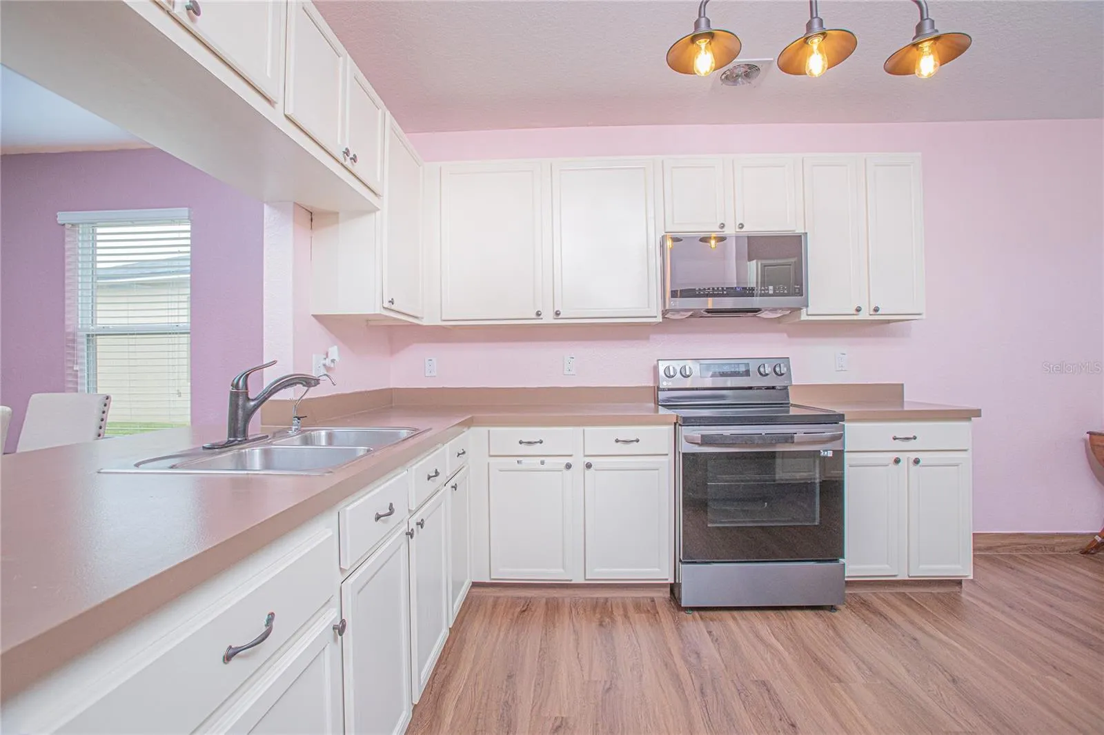 This beautifully remodeled 3-bedroom, 2-bathroom home features a chef’s dream kitchen, perfect for both everyday meals and entertaining. The kitchen boasts modern 42-inch cabinetry, brand-new appliances, a double osmosis water filtration system, and a spacious breakfast area. The open design seamlessly connects the kitchen to the living room and an additional dining area, offering plenty of space for gathering and relaxation.