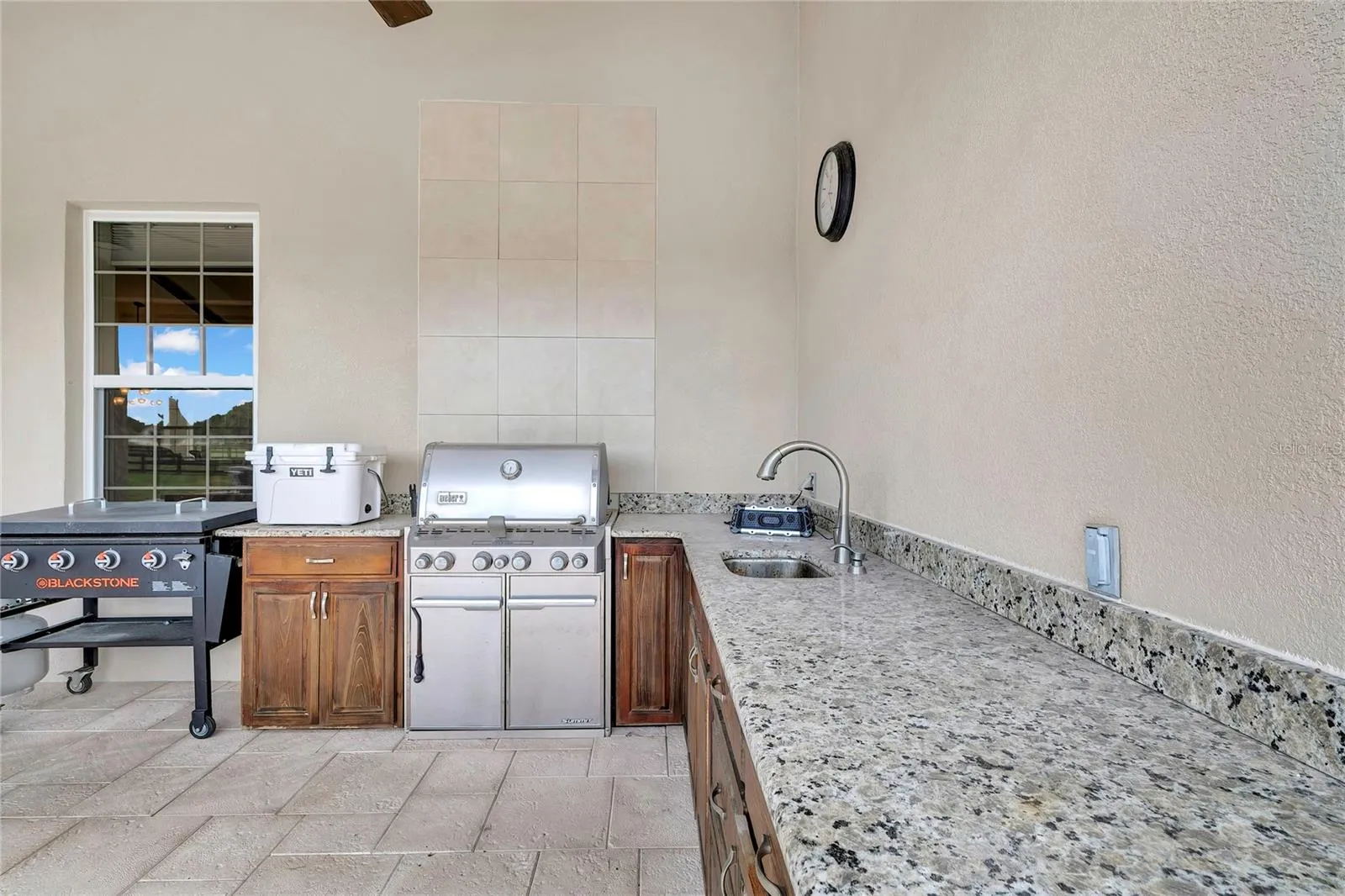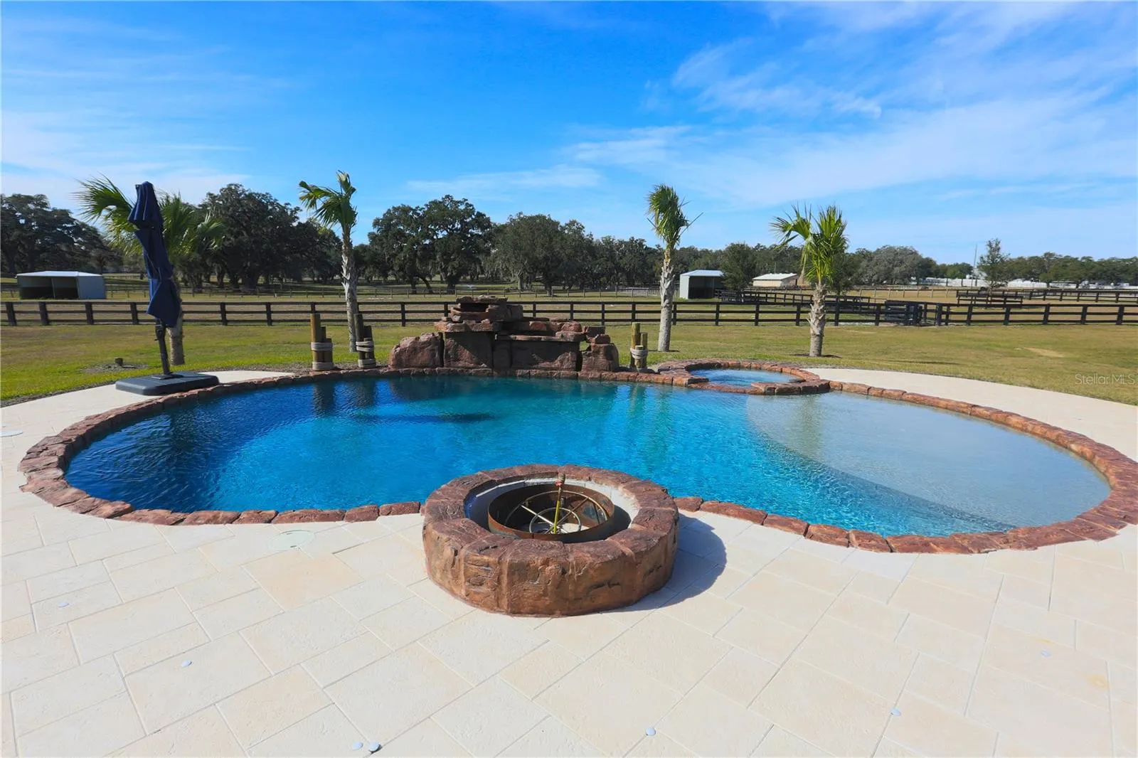 If you love hosting gatherings, the expansive back patio will not disappoint. It offers a large, covered area with plenty of space for seating, a full summer kitchen, a built-in fire pit, and inviting outdoor lighting, ensuring enjoyment both day and night. Adding to the enjoyment is a heated saltwater pool, spa, and waterfall with a self-cleaning system.