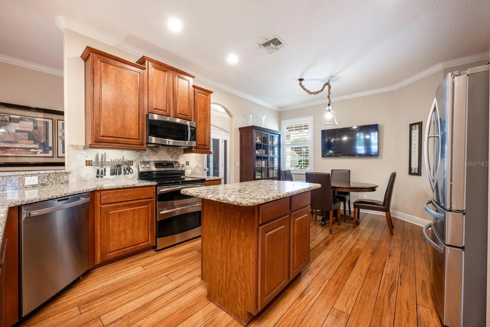 The kitchen shines with granite countertops and stainless steel appliances, complete with a convenient eat-in space. The primary bedroom is generously sized, as are all other bedrooms, providing ample space for everyone. A dedicated theater room adds a touch of luxury to your entertainment options.