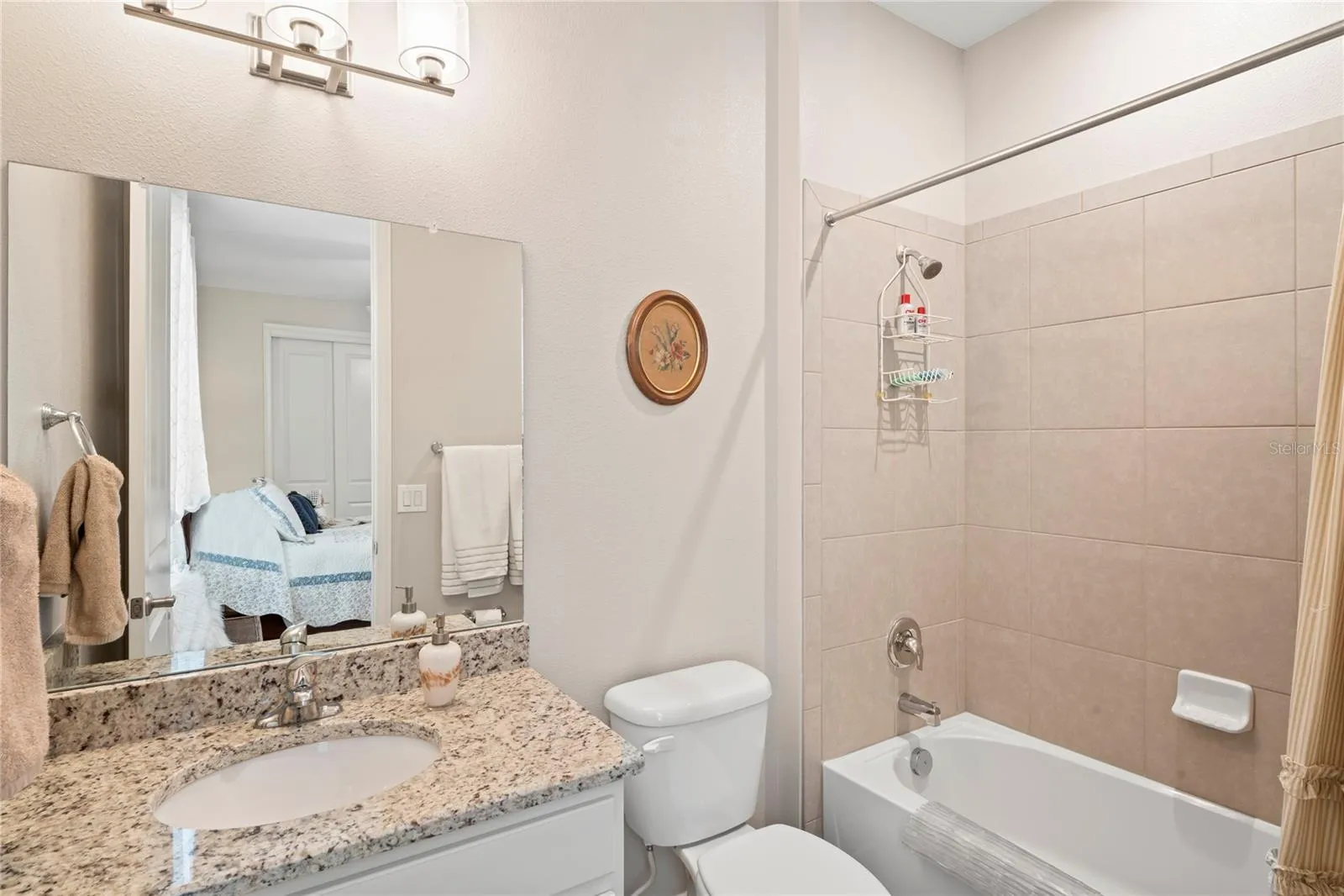 Primary suite includes two walk-in closets and a spa-like bath with granite double vanity and walk-in shower. Guest bath also features granite finishes. French doors open to a flexible office/3rd bedroom.