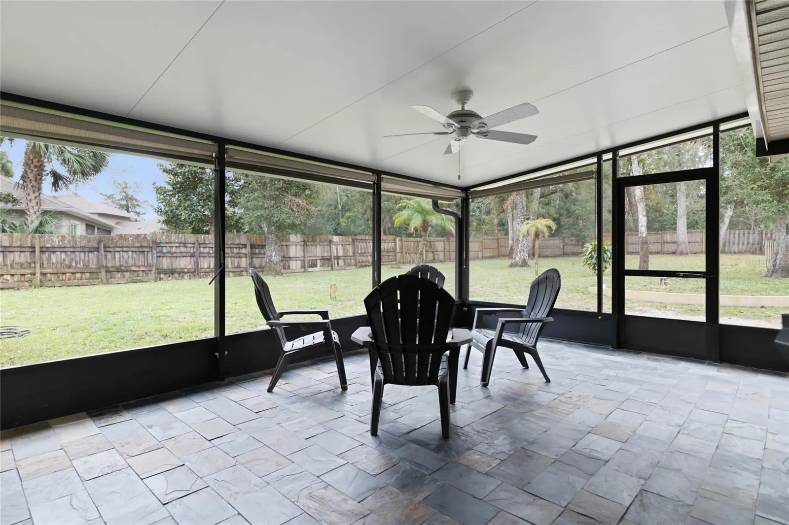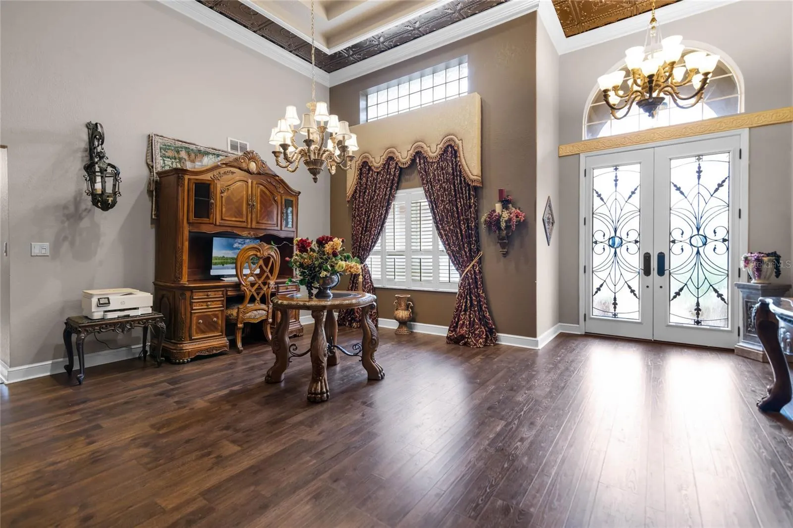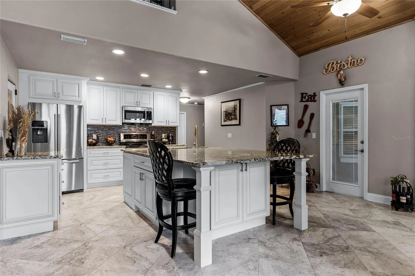 This stunning, unique and updated 4-bedroom, 2.5-bath custom home offers a perfect blend of luxury, privacy, and craftsmanship. Situated just 15 min from the beach, this home has over half an acre with mature landscaping, a spacious yard, and so many possibilities for creating your dream outdoor oasis. Enter through the custom 8-foot double door main entry and be welcomed by an open-concept floorplan with soaring 14-foot volume ceilings and luxury finishes such as copper tile accents, crown molding, and rich wood-grain tile flooring. The architectural details, including elegant niches, evoke timeless sophistication. The first-floor owner’s retreat is a true sanctuary, featuring a double tray ceiling, a spacious walk-in closet, and a spa-like ensuite, with unique tile work, a wood-grain double vanity, granite counters, a soaking tub, a walk-in shower, and a private water closet. The chef’s kitchen is a masterpiece with a large central island offering ample prep space and seating. Custom white wood cabinetry, granite countertops, SS appliances and a pantry with a decorative glass door elevate the space. The open layout seamlessly connects the kitchen to the living area, enhanced by wood tongue-and-groove ceilings, providing a perfect setting for entertaining or everyday living. The second floor offers three spacious guest bedrooms, a loft area, and a full bath, creating a private haven ideal for kids, guests, or multigenerational living. The home extends its entertainment possibilities with a large, screened patio, perfect for enjoying serene backyard views. And best of all, it has easy access to shopping, I-95, and the beach! It’s also located 5 min from one of the most picturesque and enjoyable golf courses on the East Coast of Central Florida – the Halifax Plantation Golf Club – which has an 18-hole course, a southern-style clubhouse, a restaurant and pub as well as exercise facilities and tennis courts. This home is truly a one-of-a kind opportunity with something for everyone!