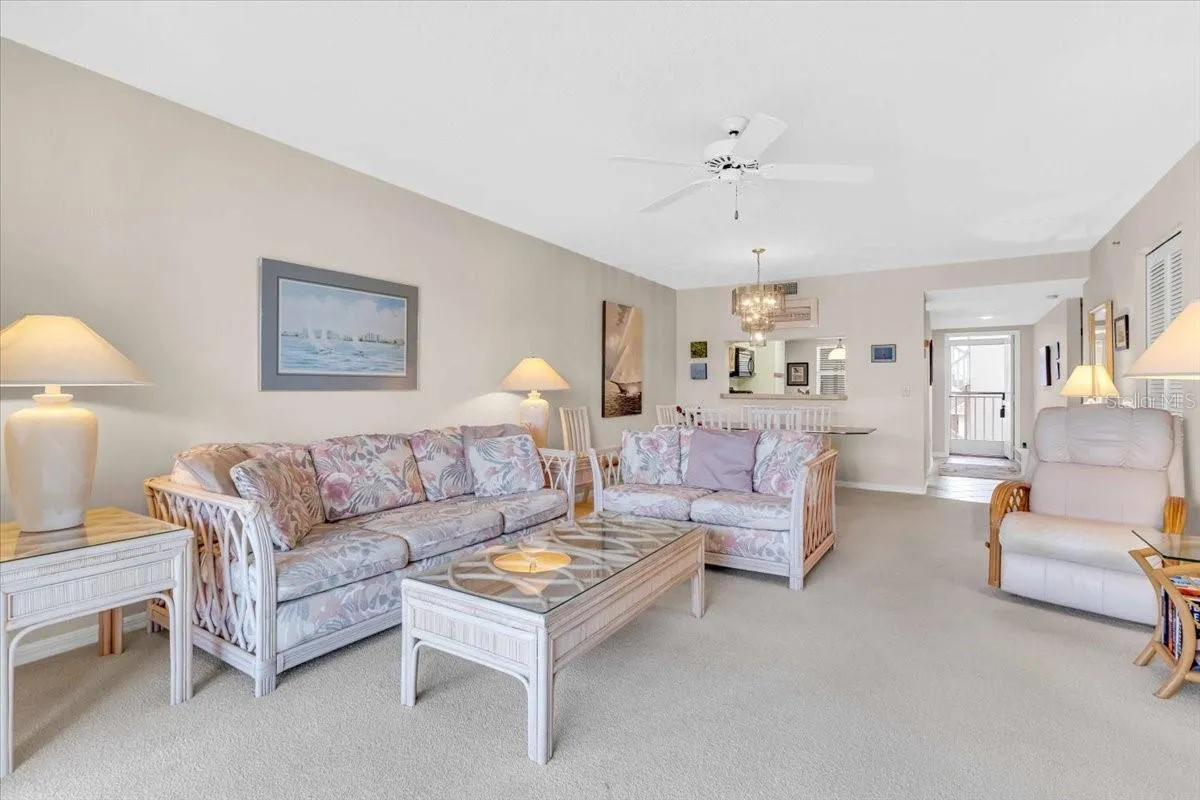 The condo has a pass-through window to the dining area for easy entertaining. Open living area looking out to the lanai. Primary bedroom with attached bathroom, and a nice walk in closet. Guests are at the other end of the condo with a full bath outside the door. Laundry room with washer and dryer makes it easy to keep up with beach towels!