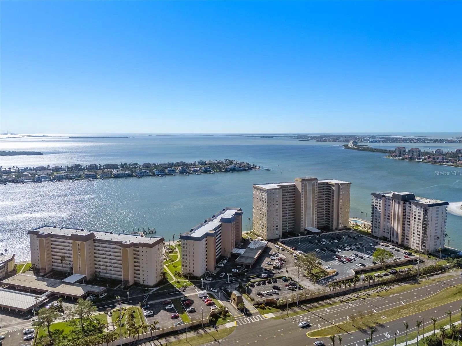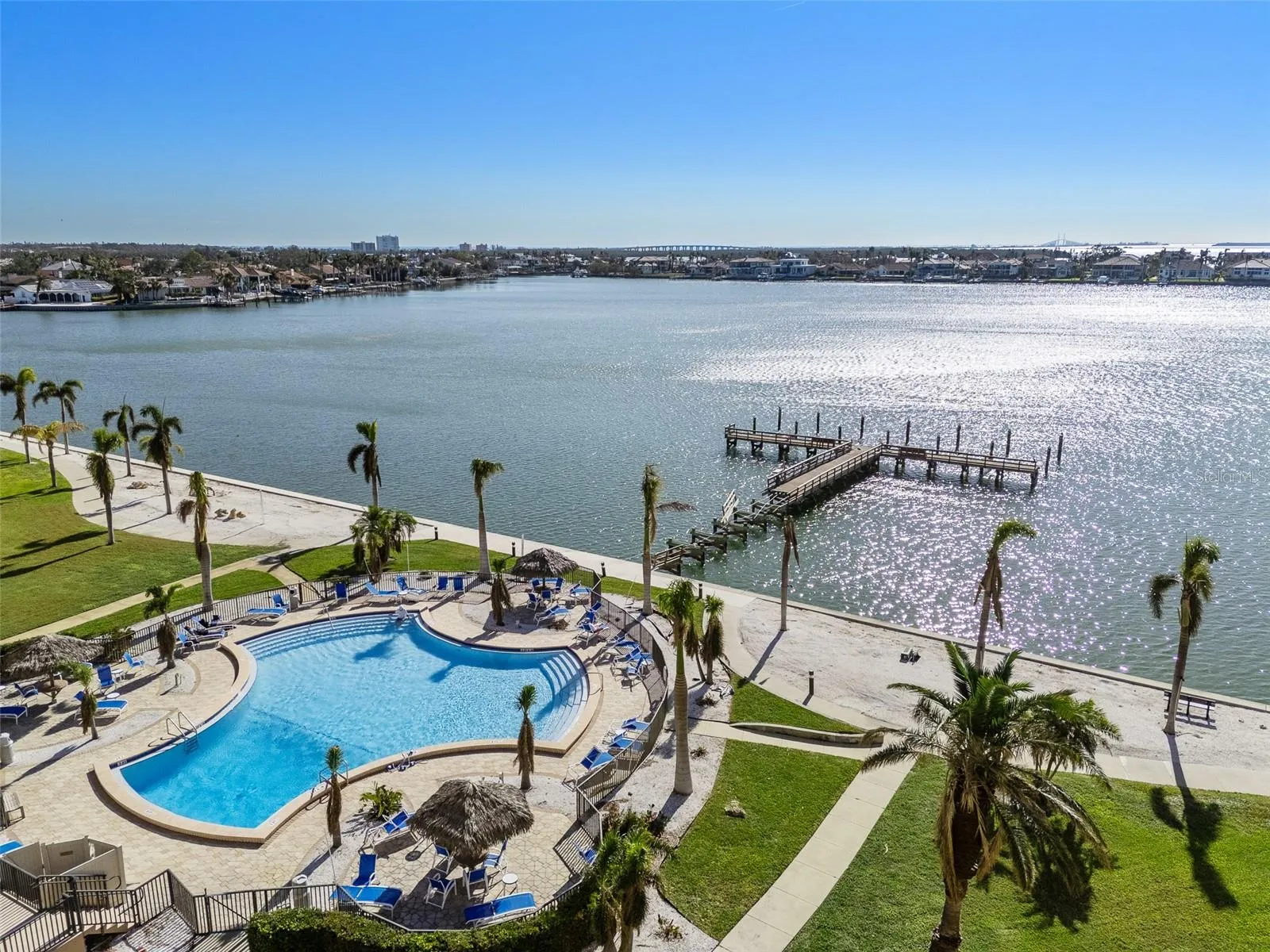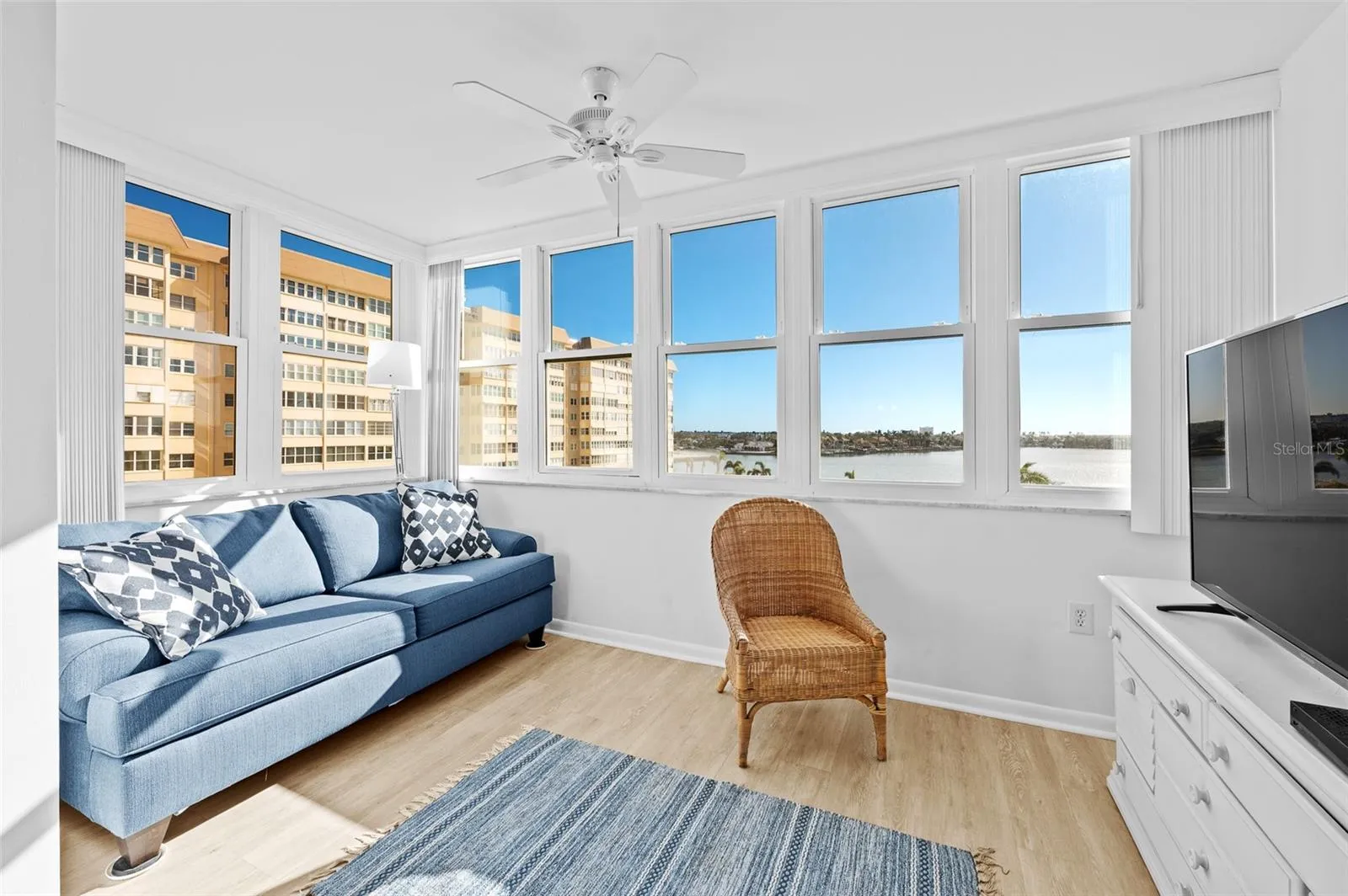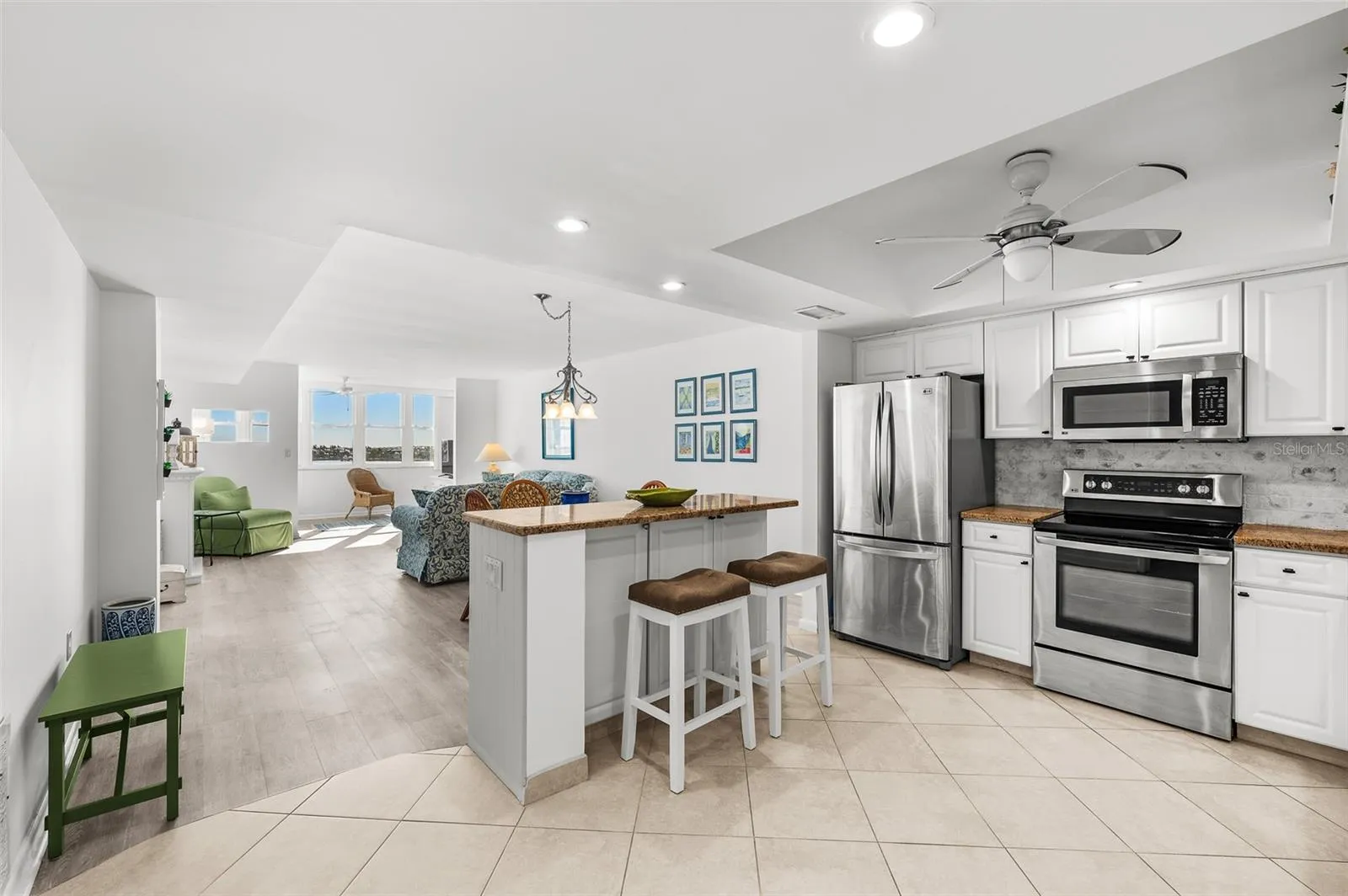 areas, all bathed in natural light. The expansive windows frame breathtaking views of Boca Ciega Bay, creating a serene backdrop for daily life. The well-appointed kitchen features modern appliances and abundant cabinetry, catering to both everyday meals and