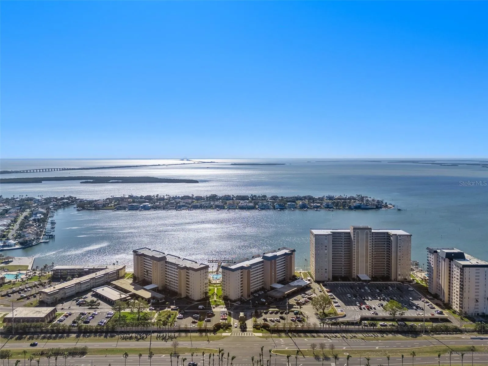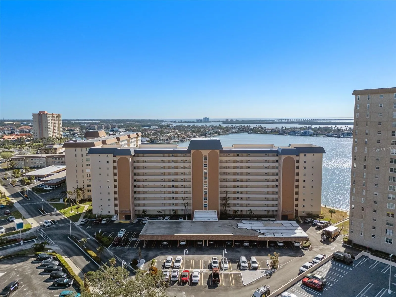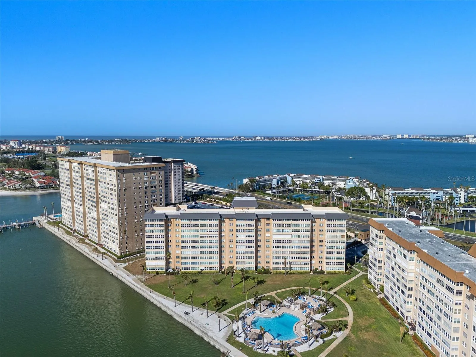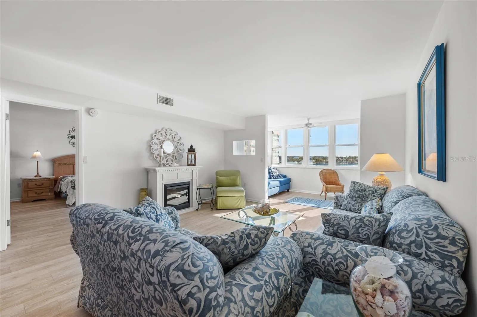 areas, all bathed in natural light. The expansive windows frame breathtaking views of Boca Ciega Bay, creating a serene backdrop for daily life. The well-appointed kitchen features modern appliances and abundant cabinetry, catering to both everyday meals and