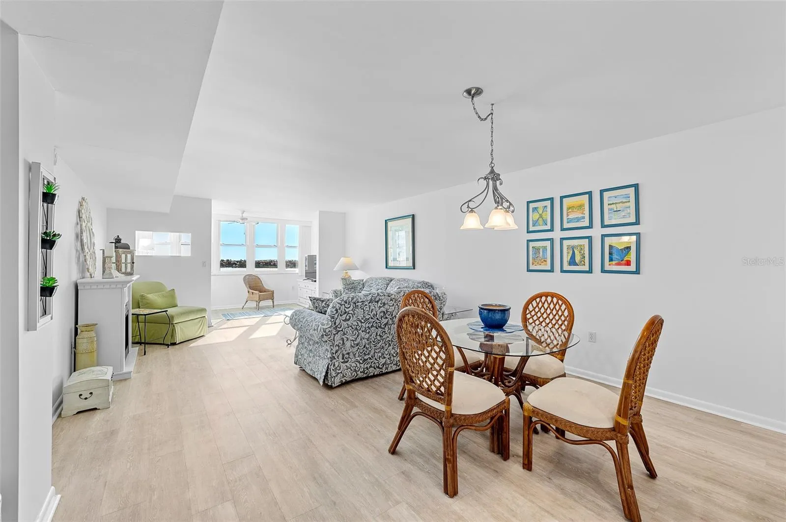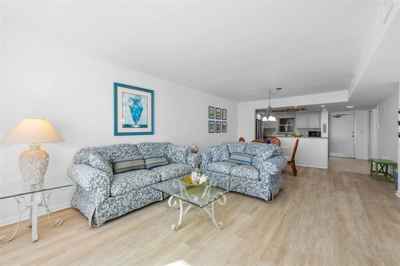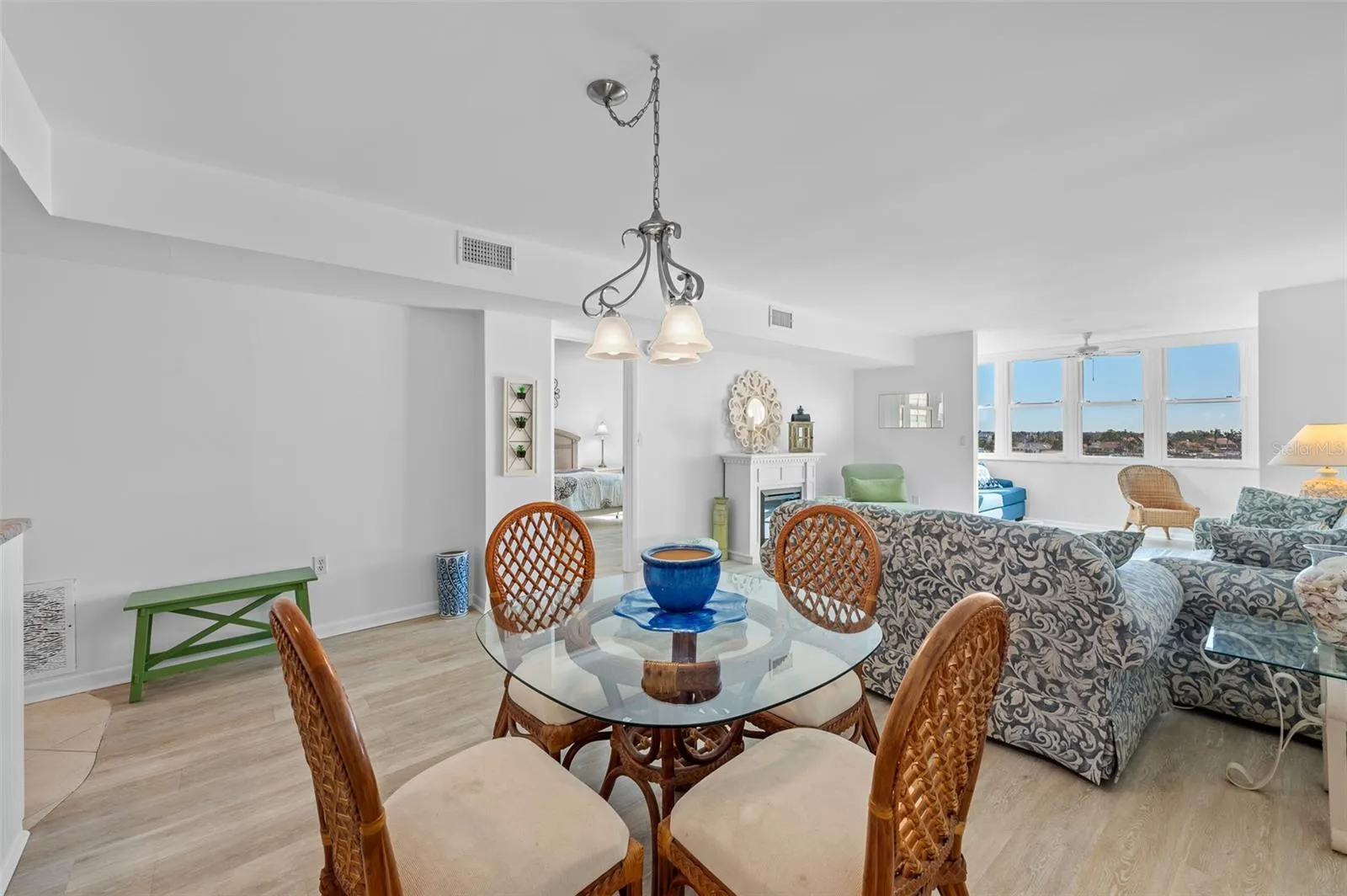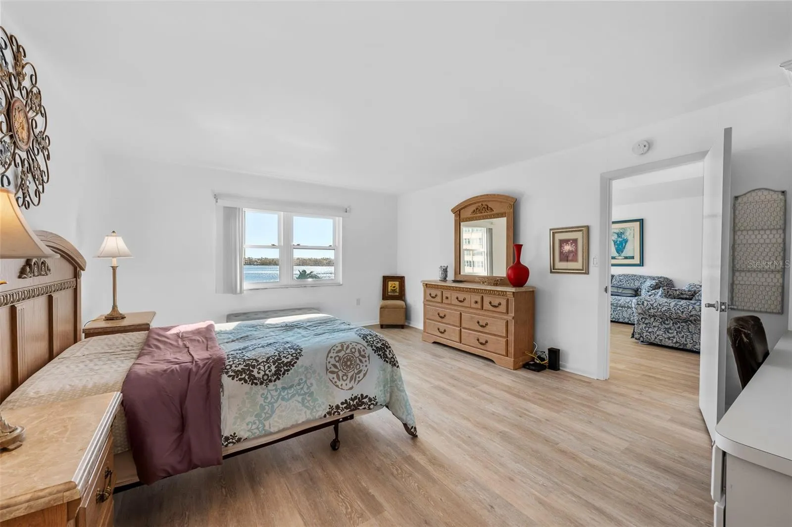 areas, all bathed in natural light. The expansive windows frame breathtaking views of Boca Ciega Bay, creating a serene backdrop for daily life. The well-appointed kitchen features modern appliances and abundant cabinetry, catering to both everyday meals and