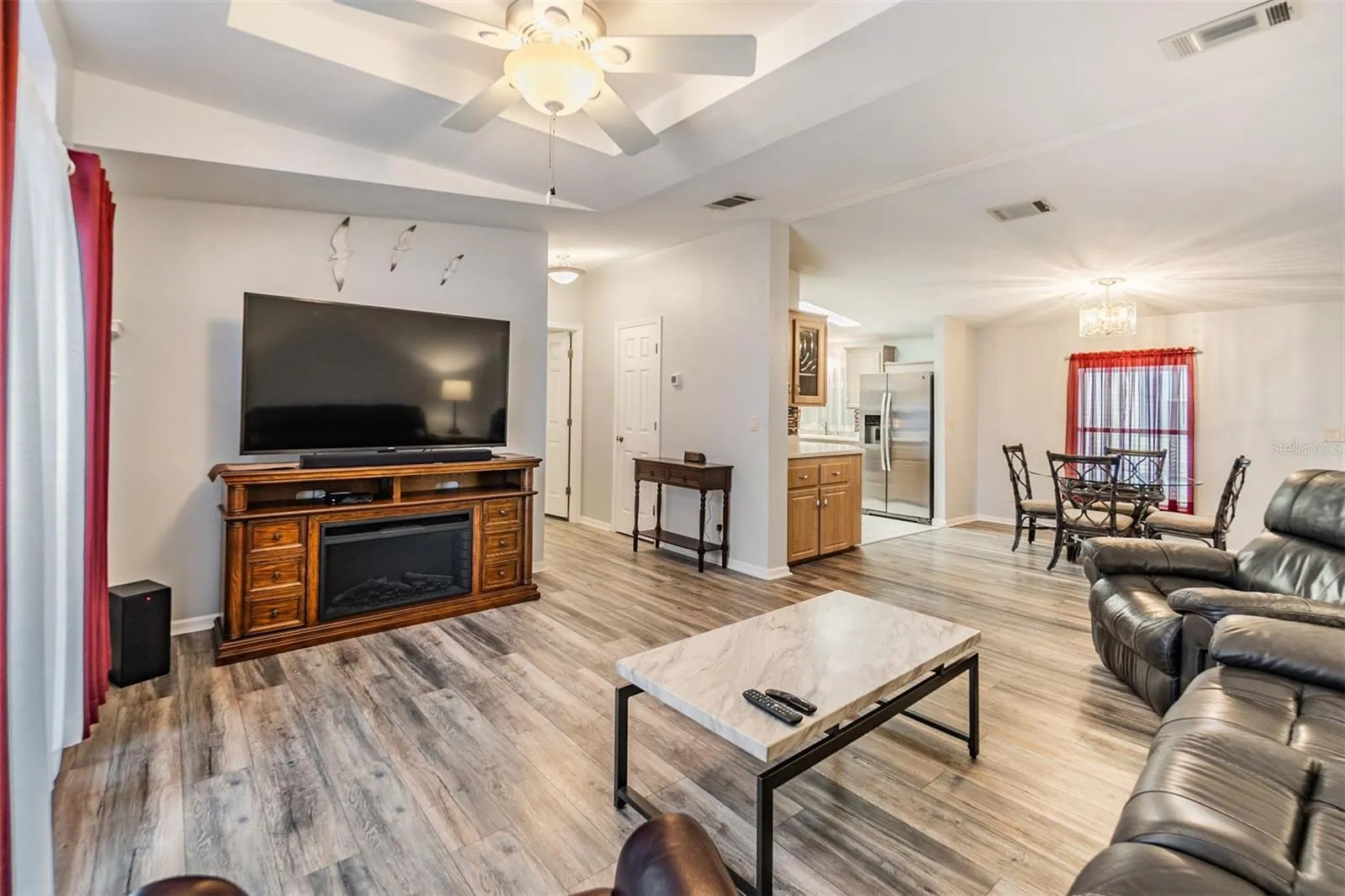 Stunning Home in GATED Grand Horizons, where you OWN YOUR LAND… is Updated, Furnished and READY for new owners! This 2 bedroom, 2 bath, meticulously maintained home features over $40,000 in enhancements, offering style, comfort, and peace of mind as you Move Right In! Freshly painted driveway is sparkling clean! OPEN concept in the Living and Dining spaces make it easy to entertain. Enjoy the light, bright, natural lighting from your double window with transoms above in this area, with stylish tray ceiling, upgraded lighting and ceiling fans in the great room adding to the casual elegance. Galley kitchen has gleaming counters with contrasting backsplash, newer appliances and sliding door to the screened lanai. The exterior is equally impressive, with refreshed landscaping added in 2019. Other Notable upgrades include newer Kenmore appliances (2018), GE washer and dryer (2017), and a state-of-the-art AC system with new ductwork (2018). The interior showcases like a model featuring durable laminate flooring (2017), luxurious Corian countertops in the kitchen and bathrooms (2022), and a freshly painted interior (2018). Additional features include a newer shower in the primary ensuite (2019 which was $10,000), a newer water heater in 2019 and a sturdy Metal Roof in 2018. The water shut-off valves were also replaced for added convenience, and tinted windows (2019) enhance energy efficiency. Custom blinds, landscaped lawn with lattice work added in the carport for privacy, and a screened slider door enables indoor-outdoor living. This home is a rare find, combining thoughtful upgrades with the vibrant lifestyle of this active 55+ community which offers No CDD fees and low HOA which includes use of the Resident owned amenities, Gated entrance, Private road maintenance and Common area lawncare. Clubhouse offers numerous onsite events with bingo, potluck dinners, outside entertainment, craft/sewing/quilting room, library with games, movies and puzzles, billiards, bocce, cornhole, horseshoes,, shuffleboard, heated pool, hot tub and planned travel excursions and social activities. Located in Zephyrhills north of Tampa within one mile of medical facilities, bowling, movie theater, restaurants, shopping, parks and major highways for easy commute to Wesley Chapel, Lakeland, Ocala, Tampa, St Pete, Orlando, the Airports and Beaches! CALL TODAY to see why this IS the place to BE!