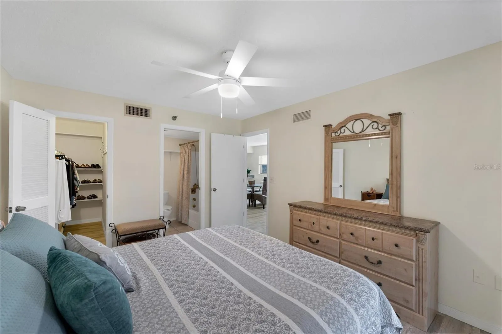 The Owner’s Bedroom comfortably fits king-sized furniture, includes a generously sized walk-in closet, and features an en-suite bathroom for added privacy and convenience. A second bathroom and guest bedroom are thoughtfully positioned on the opposite side of the unit for maximum comfort. Additional upgrades include window blinds, ceiling fans, newer light fixtures, newer HVAC and water heater updates, enhancing the home’s modern appeal.
