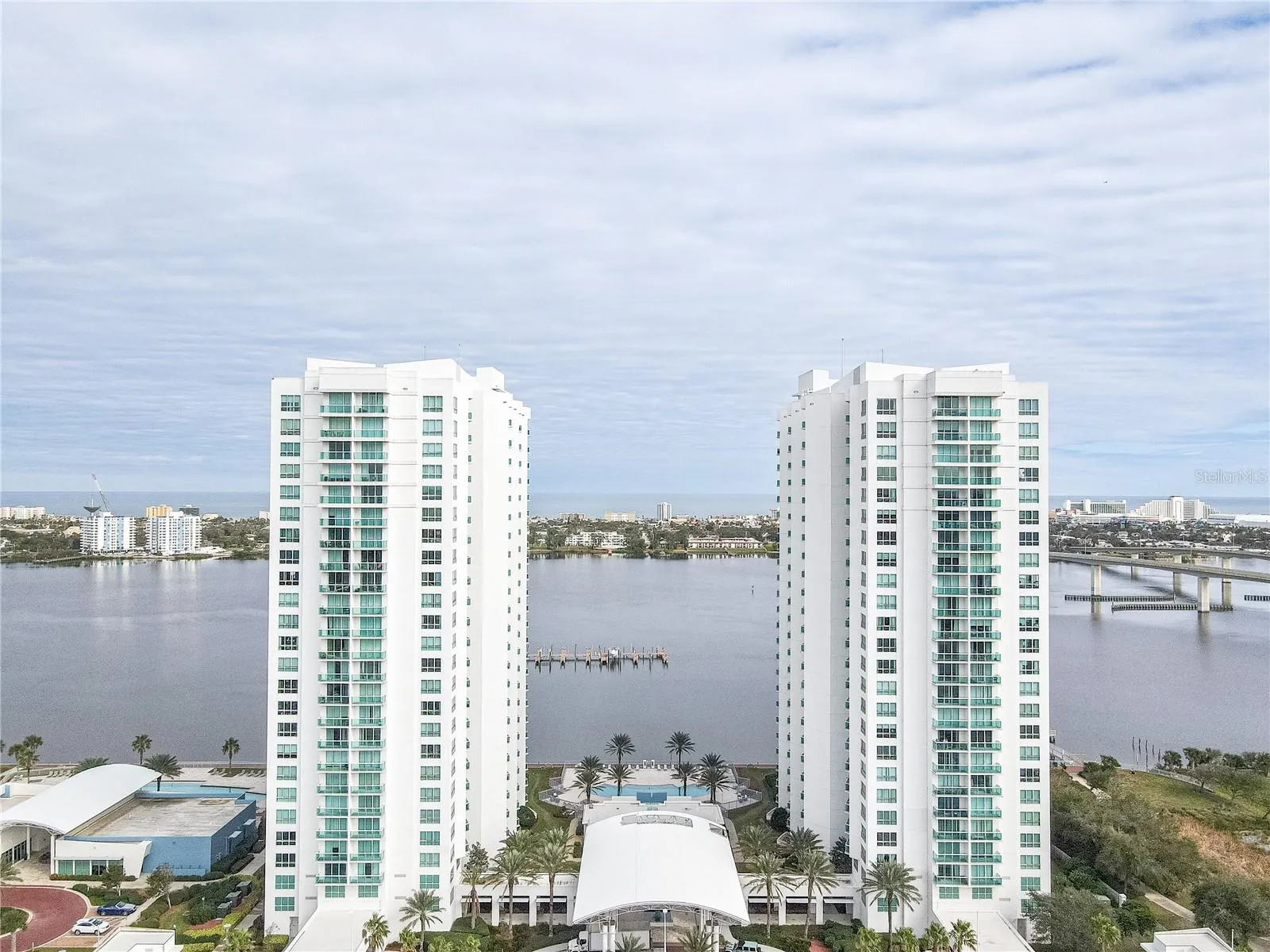 Welcome to your dream home! This stunning 2-bedroom, 2-bathroom luxury condo with a den offers unmatched elegance and breathtaking views. Perched on the 12th floor, this east-facing unit boasts panoramic views of the serene Halifax River and the sparkling waters of Daytona Beach Shores. Step inside to find a spacious, open-concept living area with high-end finishes throughout. The gourmet kitchen features modern appliances, sleek countertops, and ample storage, perfect for entertaining or enjoying quiet nights at home. The den provides a versatile space that can serve as a home office, guest room, or media lounge. For added convenience, the unit includes an in-unit washer and dryer, one covered parking space, and a private storage room to meet all your needs. Relax and unwind on your private balcony as you take in spectacular sunrises over the ocean and river. Marina Grande on the Halifax offers resort-style amenities, including multiple pools, a state-of-the-art fitness center, a movie theater, a game room, and a 24-hour concierge. Located minutes from the beach, shopping, and fine dining, this condo combines luxurious living with convenience. Don’t miss this rare opportunity to own a piece of paradise—schedule your private showing today!