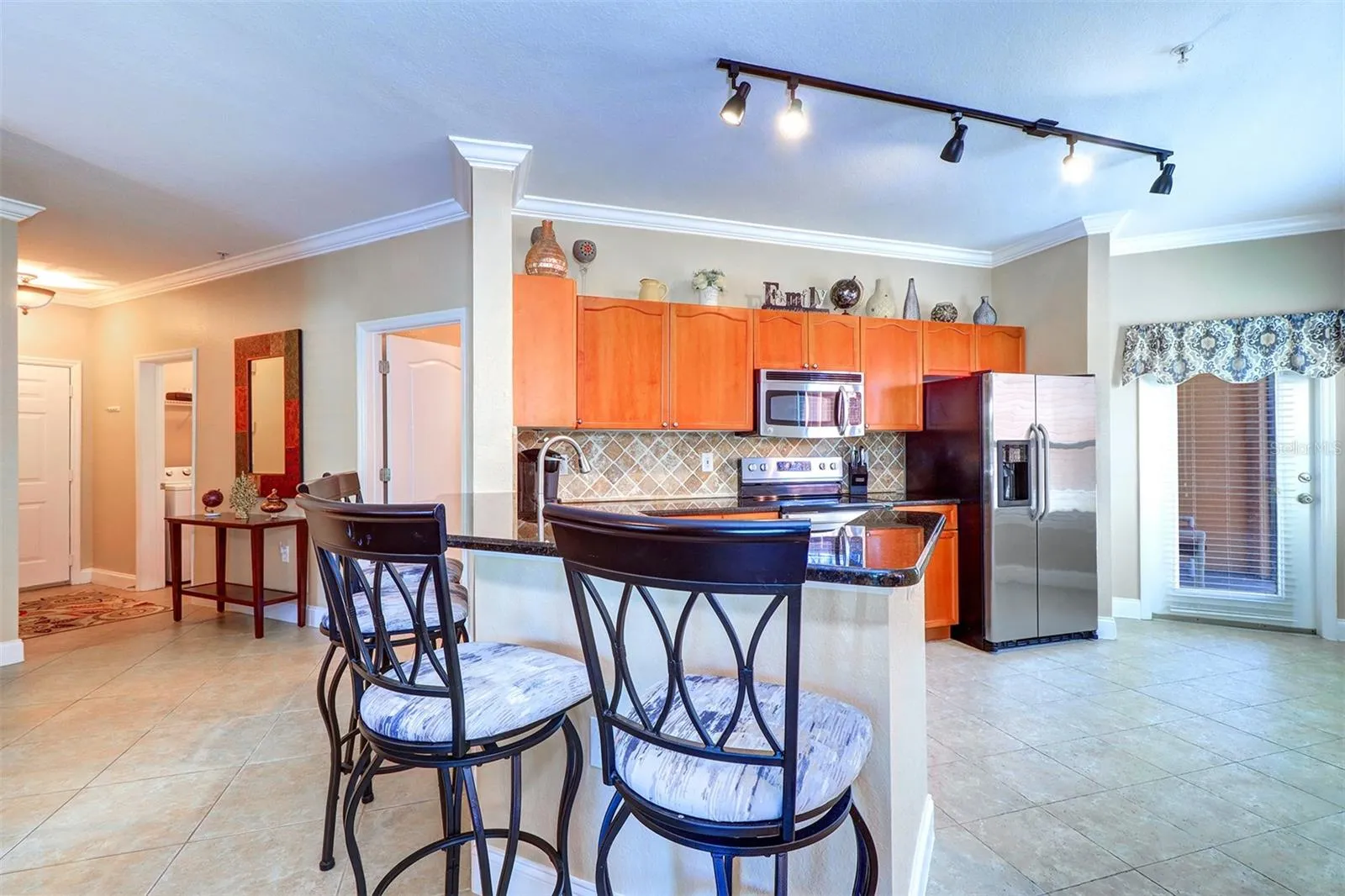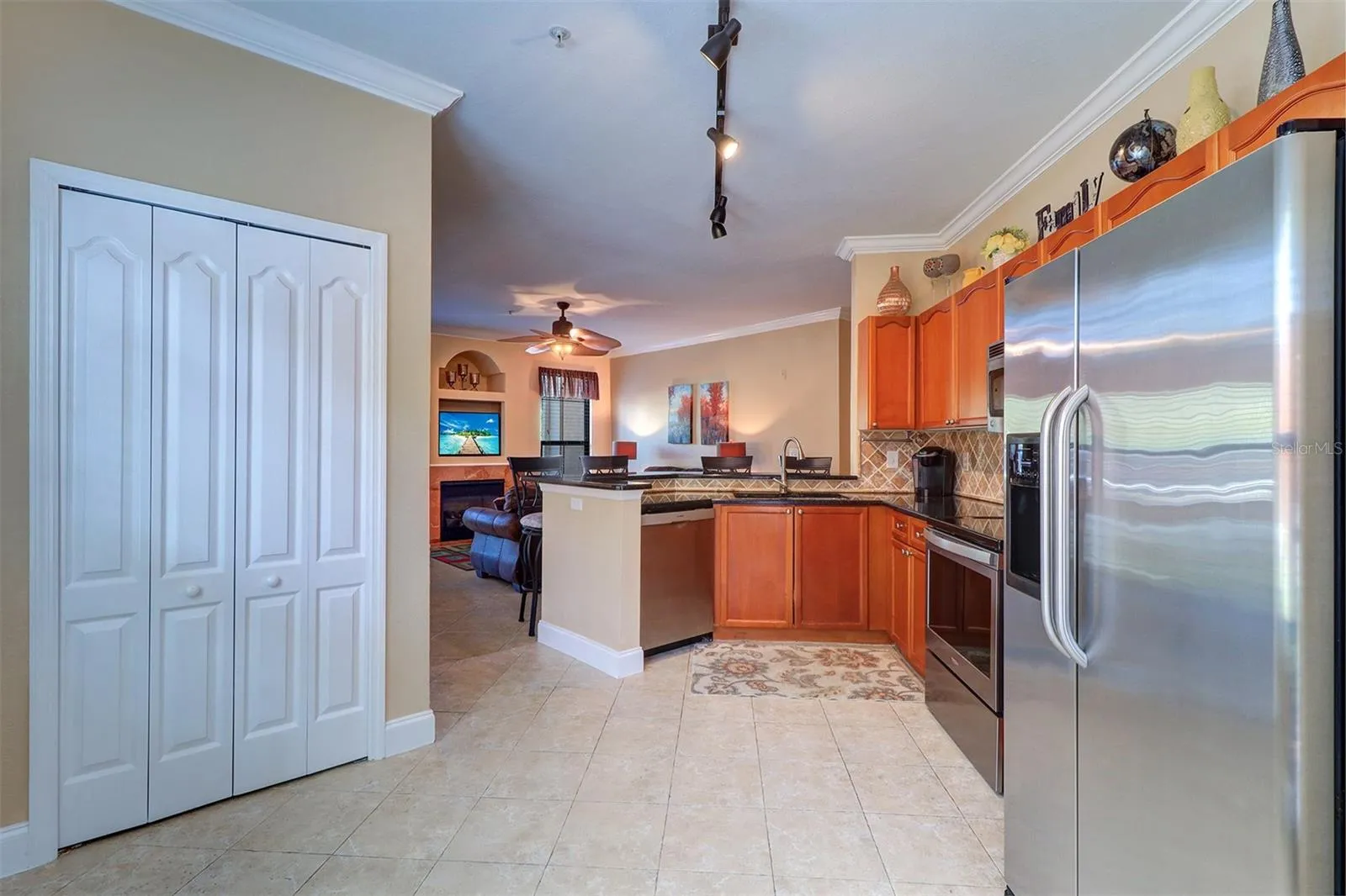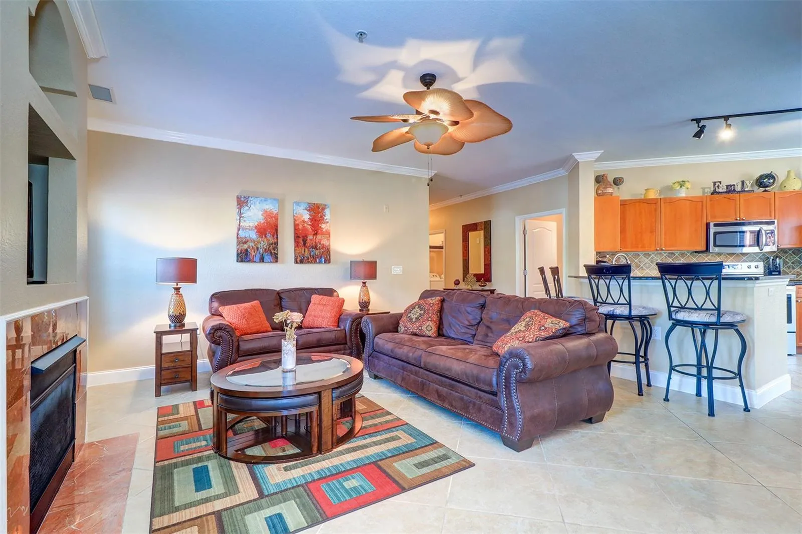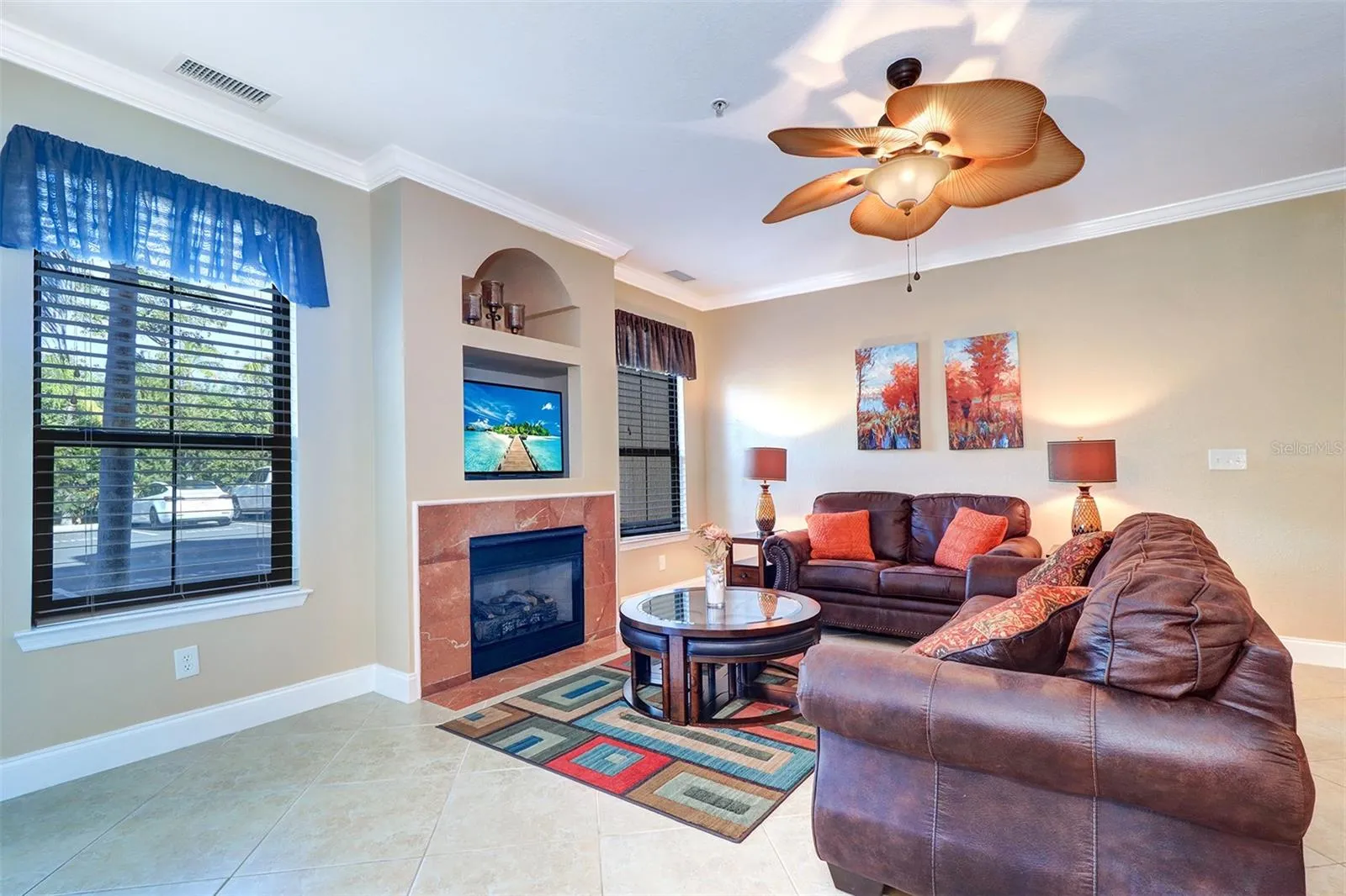This condominium is located in the gated waterfront condominium community of The Grand Bellagio at Baywatch. This 1443 sq ft first floor corner Frascati floor plan comes with Storage Unit S-109 and Assigned Parking Space 204. Meticulously maintained this condo has 2 bedrooms and 2 full baths with den/office/study for remote work or overflow bedroom for guests. Storage unit is 52 sq ft and located directly across from the condo on the first floor with 9 ft 4 in ceilings for multiple storage boxes. The Frascati residence is light and bright with generous and spacious floor plan that has a 3-way split between the 2 bedrooms and the den with living, dining and kitchen areas in between. Kitchen features wood cabinetry, granite counter tops, stainless steel appliances, breakfast bar that accommodates approximately 4 barstools, eat-in area & large closet pantry; dining and living area with gas fireplace & built-in entertainment center has large windows flanked on each side; crown molding in living, dining, eat in kitchen and foyer; 24×24 tile throughout on diagonal; inside utility room with full size washer and dryer; coat & linen closets; screened terrace with 4×4 pavers off kitchen and primary bedroom; spacious primary bedroom and bath with cultured marble double vanity and tile, garden tub and separate shower; 2nd bath adjacent to 2nd bedroom can also be an en-suite. Window treatments/blinds 2016 & 2024; hot water heater 2015; ceiling fans 2016; wall safe 2016; garbage disposal Dec 2022; painted interior throughout April 2023; hurricane impact windows 2023 into early 2024. All room sizes are approximate. Grand Bellagio amenities include a 6800 sq ft social villa with 24 hour fitness center, billiards room, owners conference room, club/TV room, geo-thermal heated pool & spa; poolside cabanas, kayak, entertainment and sun deck pavilions, 1 1/2 mile waterfront lighted promenade. Pavilions are under renovation. Marina known as THE DOCKS AT BELLAGIO consists of 62 privately owned boat slips exclusively for Grand Bellagio owners and is its own condominium association. Boat slips have water and electric and private slips are for rent or sale from time to time. Renovations are currently ongoing at the marina. Storage container outside dining room window has supplies for dock renovations and is temporary. Designated as a Clearwater residential condominium community, NO AIRBNB OR SHORT TERM RENTALS in The Grand Bellagio. The community just completed a 2 1/2 year renovation project of new roofs, new widows, new siding, new road paving, all new landscaping. Please refer to grandbellagio.org for all documents pertinent to the renovation project. RESIDENTIAL LIVING WITH A RESORT STYLE APPEAL!