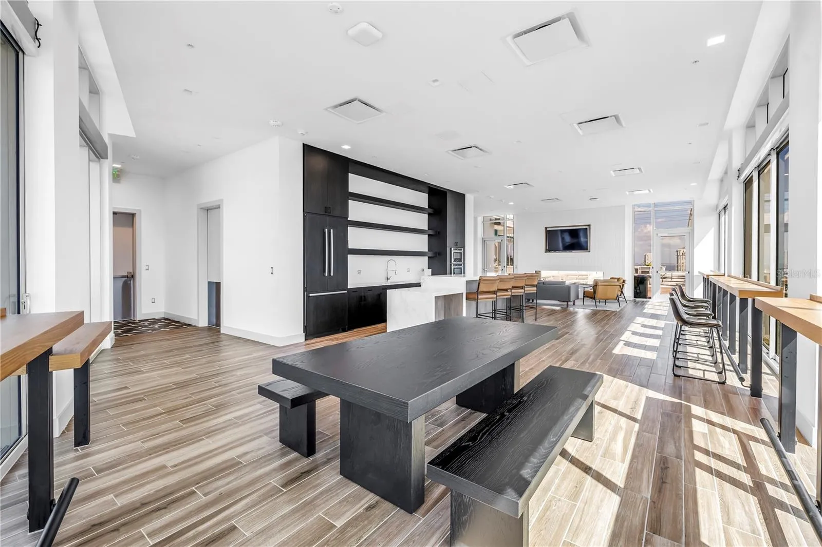 Residents enjoy exclusive access to a 12,000-sq-ft rooftop oasis with a heated saltwater pool and spa, glass-walled fitness center, social club, fire pit lounge, and outdoor kitchen—all set against panoramic city and bay views.