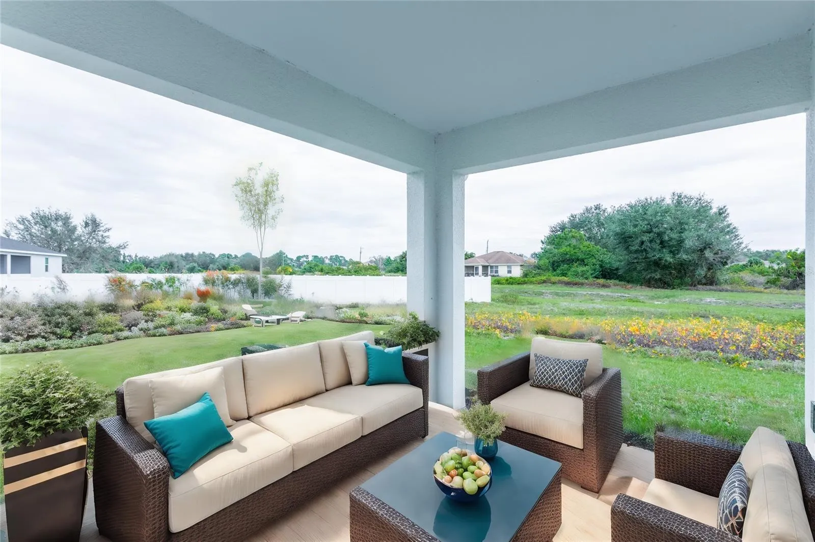 The home boasts Magnisi 8×12” white upgraded tiled walls in in the second bath/shower, a Santa Cecilia granite vanity top, and Moen Chateau chrome faucets and shower/tub trim kits. The ampleness of this home continues with a utility room, and additions such as energy-efficient R-4.1 insulation on concrete exterior walls, Taexx tubes for pest control, and fabric hurricane shutters for every window. The Florida friendly landscaped yard is complemented by an irrigation system with a rain sensor to help maximize efficiency.