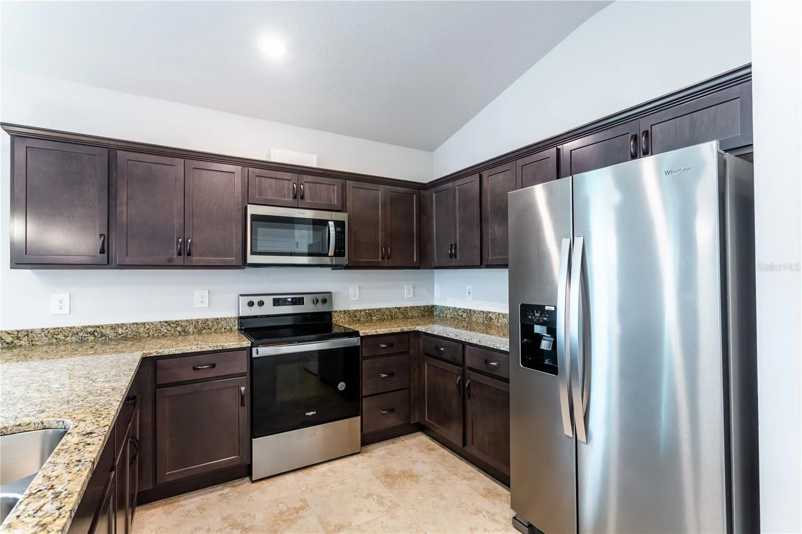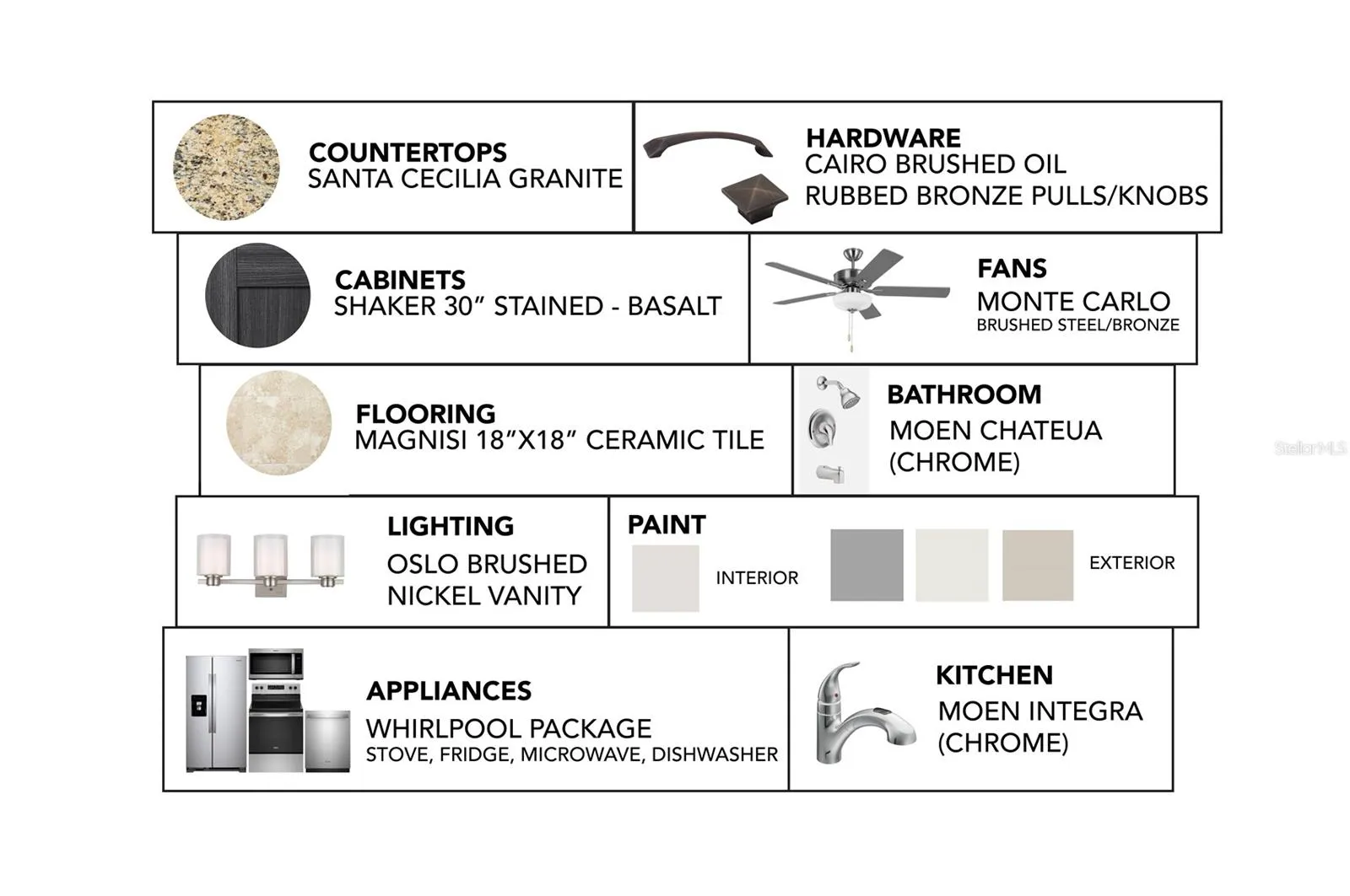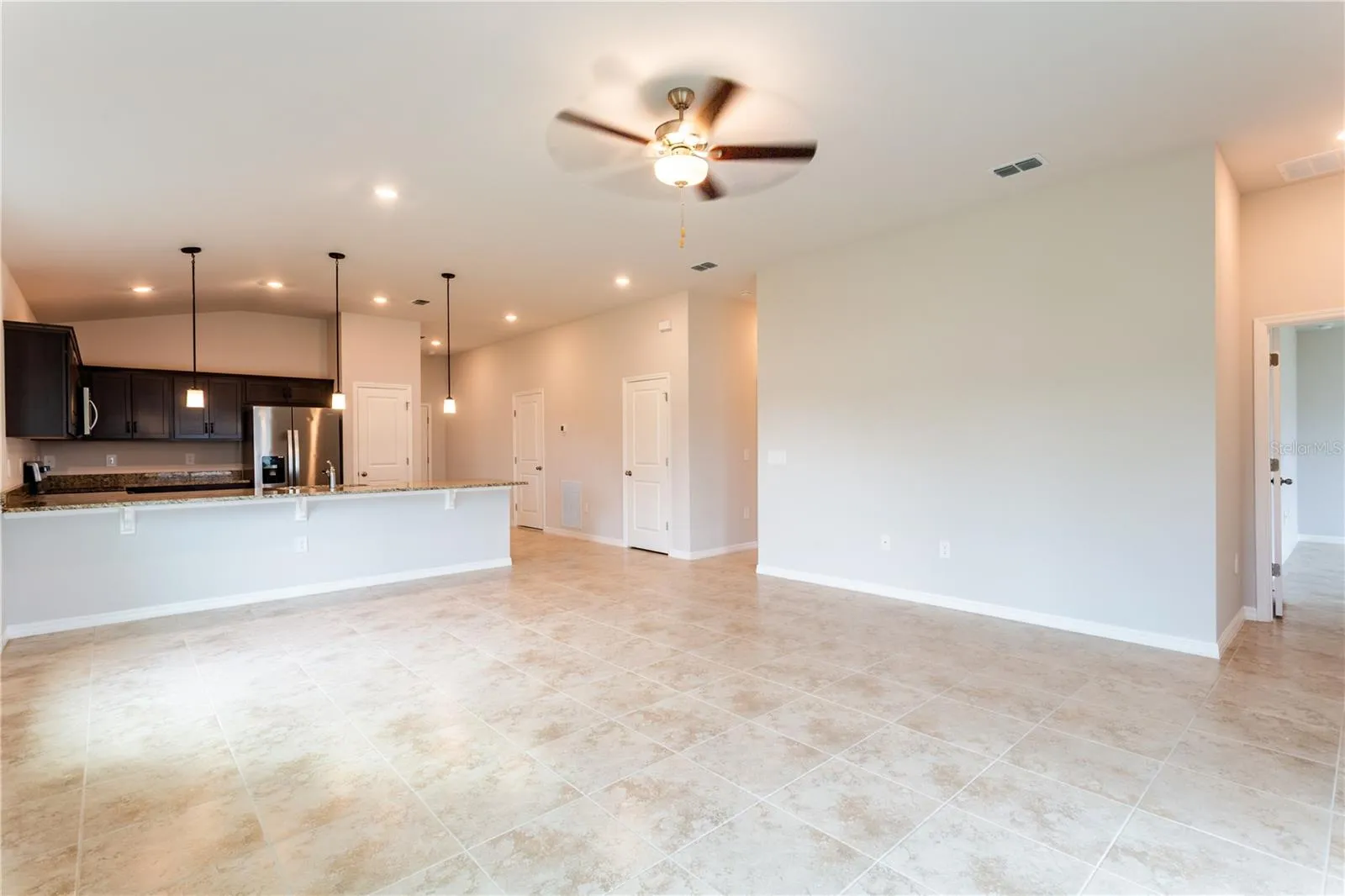 As you enter, a beautiful kitchen welcomes you, with an expansive, oversized bar that seamlessly flows into the living and dining area. The finesse of soft-close, Shaker Stained 30″ cabinets and upgraded Santa Cecilia granite countertops add a functional touch of luxury to the kitchen. Kitchen upgrades include a Moen Method chrome kitchen faucet, garbage disposal, and sleek stainless steel energy efficient appliances. This home exudes sophistication with a vaulted ceiling that unveils a spacious lanai, creating an indoor-outdoor haven. Additionally, Carpenter Homes provides an upgraded lighting package including Kemal Bronze pendants over the kitchen bar, and Oslo brushed nickel vanity fixtures in both bathrooms, accenting the overall lighting design. Brushed nickel finish ceiling fans in each bedroom, as well as the great room, helps to circulate air flow and keep you cool in the Florida weather. Complimenting the expansive living area is Magnisi 18” ceramic tile flooring.